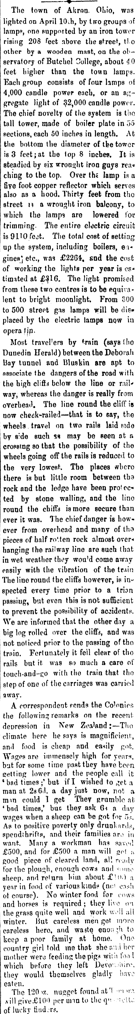 + The town of Akron. Ohio, was lighted on April 10ih, by two groups of larnpf, one supported by an iron tower rising 208 feet -ibove the street, tl o other by a woodea mask, oo the observatory of Butchel College, about 40 feet higher than the town lamps. Each group consists of four lamps of 4,000 cnndle power eaeb, or an aggregate light of $2,000 candle power. The chief novelty of the system is the tall tower, made of boiler plate in 55 sections, each 50 inches in length. At the bottom the diameter of tfee tower is 3 feet; at the top 8 inches. It is steadied by six wrought iron gays rea* ching to the top. Over the lamp ia a Bye foot copper reflector which serves also as a hood. Thirty feet; from tho street n a wrought iron balcony, to which the lamps are lowered for trimming. The entire electric circuit is 9110 fejt. The total cost of setting up the system, including boilers, eigines} etc., was £2261, snd the cost of working the lights per year is estimated at £$16. The light promised from these two centres is to be equivalent to bright moonlight. From 800 to 500 street gas lamps *?ill be dis» placed by the electric lamps npw iv opera I |p. Most travelers by f rain (says fho Dunedin Herald) between the Deborah Bay tunnel and Bluskin are apt to associate the dangers of the road with the high clifo below the line or rail" way, whereas the danger is really from overhead. The line round the cliff i» now cheek-railed — that is to 6ay, the wheels travel on two rails laid Bide by side such s« may be seen at n crossing so that the possibility of the wheels going off the rails is reduced to the very lowest. The places wbero there is but little room between tha rock and the ledge have been protected by stone walling, and the lino round the cbiffo is more secure than ever it was. The chief danger is however from overhead and many of tho pieces of half ro',ten rock almost over* hanging the railway line are such that in wet weather they wou'd come away easily with the vibration of the tr.iin The line round the cliffs however, is inspected every time prior to a trton passiug, but even this is not sufficient to prevent the possibility of accidents. We are informed that the other day a big log rolled over the cliff*, and was not noticed prior to the passing of tho trnio. Fortunately it fell clear of tho rails but it was so much a care of touch-and-go with the train that tho step of one of the carriages was carried away. A correspondent pends the CoWios the following remarks on the recent depression in New Zealand :— Tho climate here he says is magnificient;, and food is cheap and easily gofc. "Wages are immensely high for yearn, | but for some time past they have boon getting lower and the people call it 1 bad times ;' but if I wished to £et a man at 2s6il. a day just now, not a mm could 1 get They grumble ai; ♦ bad times,' buc they ask 6< a day wages when a sheep can be got for o-s. As to positive poverty only drunkard?, spendthrifts, and their families aro in want. Many a workman has saved £500, and for £500 a man will go! :i good piece of cleared land, all r<\i<ly for the plough, enough cows and sheep, and return him about £!t>;) a year in food of various kind?" (nc' cash ot course). No winter food for cows and horses is required ; they live on the grass quite well and work wvil ;iil winter. Hut careless men get inoro careless hero, and waste eno'.Vy* *° keep a poor family at home. One country girl told me thnt she r.ni her mother were feeding the pig* with foal which before they left Devo'v-iunN they would themselves gladly hnvo eaten. The 120 \%. nugget found at r ! mm m-.t ,vill give£loo per mm to the y :olL: of lucky find.-r*.