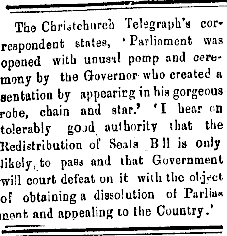 — i— — — — M *j*^"*" M * l^^^^^^^^^ — - The Cbriotchurcb Telegraph's cor- j respondent states, ' Parliament was opened with uousui pomp and ceremony by the Governor who created a sentation by appearicg in bia gorgeous robe, chain and star.' 'I bear en tolerably gojd authority that tbe Redistribution of Seata 811 is only likely, to pass and that Government will court defeat on it wilh the object of obtaining a dissolution of Parlia* menfc and appealing to the Country.'