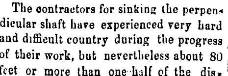 The contractors for sinking the perpen* dicular shaft have experienced very hard and difficult country during the progress of their work, but nevertheless about 80 feet or more than one half cf the dis«