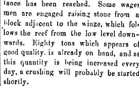 tance has been reached. Some wages men are engaged raising stone from a l>lock adjucent to the «inze, which fol» lows the reef from the lo* level downwards. Eighty tons which appears of good quality, is already on hand, and ns this quantity is l»eing increased every day, a crushing will probably be started shortly.