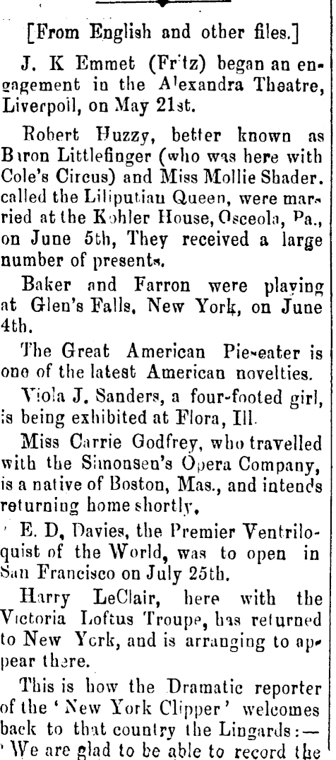 * [From English and other files.] J. K Emmet (Frtz) began an engagement in the A'exandra Theatre, Liverpoll, on May 21st. Robert Huzzy, better known as Btron Littlefinger (who was here with Cole's Circus) and Miss Mollie Shader. called tbe Liliputiau Queen, were married at the Kohler House, Osceola, Pa., on June sth, They received a large number of present*. Baker and Farron were playing at Glen's Falls, New York on June 4th. The Great American Pie»eater is ono of the latest American novelties. Viola J. Sanders, a four-footed girl, is being exhibited at Flora, 111. Miss Carrie Godfrey, who travelled with the Siinonseu's Opera Company, is a native of Boston, Mas., and intends returning home shortly, ■ E. D, Davies, the Premier Ventriloquist of the World, was to open in San Francisco on July 25th. Harry LeClair, here with the Victoria Loftus Troupe, his relumed to New York, and is arranging to appear thire. This is how the Dramatic reporter of the • New York Clipper ' welcomes back to that country the Lingards:-— IWe are glad to be able to record the :