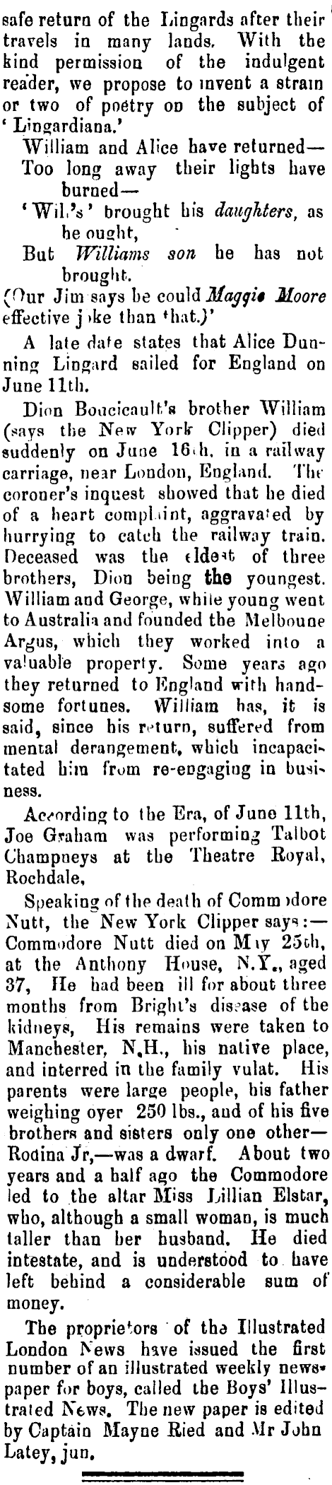 safe return of the Lingards after their travels in many lands. With the kind permission of the indulgent reader, we propose to invent a strain or two of poetry od the subject of ' Lingardiana.' William and Alice have returned— Too long away their lights have burned — ' WilY brought his daughters, as he ousht, But Williams son he has not brought. (Our Jiursays be could Magqis Moore effective j ike than *hat.,)' A late date states that Alice Dunning Lingard sailed for England on June 11th. Dion Boiicicault's brother William (says the New York Clipper) died suddenly on June 16« h. in a railway carriage, near London, England. Tincoroner's inquest showed that he died of a heart complaint, aggravated by hurrying to catch the railway train. Deceased was the tlde^t of three brothers, Dion being the youngest. William and George, while young went to Australia and founded the Melboune Argus, which tbey worked into a valuable property. Some years ago they returned to England with handsome fortunes. William has, it is said, since his return, suffered from mental derangement, which incapacitated hira from re-engaging in busU ness. According to tbe Era, of Juno 11th, Joe Graham was performing Talbot Champneys at the Theatre Royal, Rochdale, Speaking of the death of Coram >dore Nutt, the New York Clipper says:— Commodore Nutt diedonMiy 25ch, at the Anthony House, N.Y., aged 37, He had been ill for about three months from Bright's disease of the kidneys, His remains were taken to Manchester, N,H,, his native place, and interred in the family vulat. His parents were large people, his father weighing oyer 250 lbs., aud of his five brothers and sisters only one otherRod ma Jr, — was a dwarf. About two years and a half ago the Commodore led to the altar Miss Lillian Elstar, who, although a small woman, is much taller than her husband. He died intestate, and is understood to have left behind a considerable sum of money. The proprietors of the Illustrated London News have issued the first number of an illustrated weekly news* paper for boys, called tbe Boys' Illustrated News. Tbe new paper is edited by Captain Mayne Ried and Mr John Latey, jun.