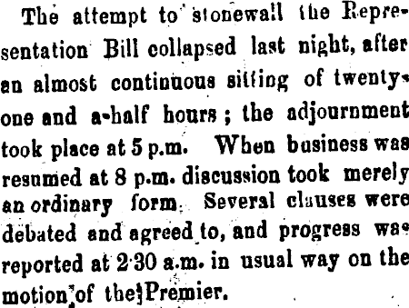 The attempt to" stonewall ihe Representation Bill collapsed last night, after an almost continuous silling of twenty* one and a-half hours ; the adjournment took place at 5 p.m. When business was resumed at 8 p.m. discussion took merely an ordinary form- Several clauses were debated and agreed to, and progress wa« reported at 2 30 a.m. in usual way on the motion'of theJPreJpoier.