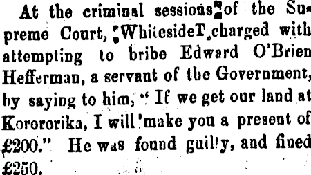 At the criminal sessionsjof the Supreme Court, JWhUesideT^charged with attempting to bribe Edward O'Brien Hefferman, a servant of the Government, by saying to him 3 " If we get our land at Korororika, I wiU'make you a present of £200." He was found guilty, and fined £'2150. y.<A ■