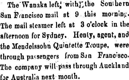 The'Wanaka left* wuh3;tbe Soushern San Francisco mail st 9 this morning. Tbe mail steamer left at 3 o'clock in the afternoon for Sydney. Henly, agent, and the Mendelssohn Quintette Troupe, were through passengers from Sun Frano'sco. The company will ptass through Auckland for Australia next month.