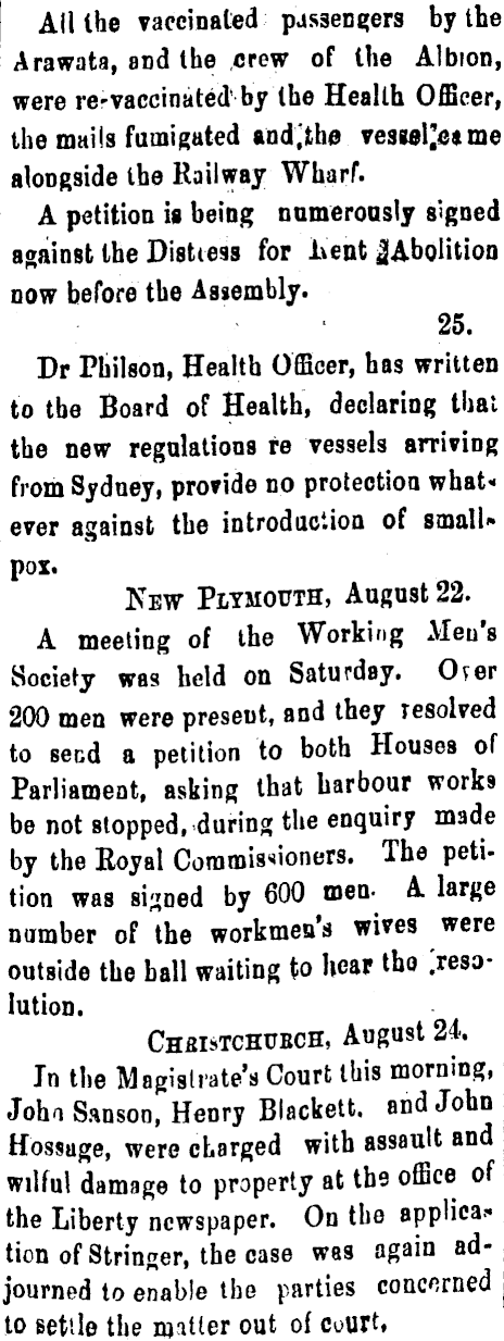 All the vaccinated passengers bythe Arawata, and the crew of the Albion, were re- vaccinated by the Health Officer, tbe mails fumigated and, the vessel.'ci me alongside the Railway Wharf. A petition is being numerously signed against the Distte9S for Lent now before the Assembly. 25. Dr Philson, Health Officer, has written to tbe Board of Health, declaring that the new regulations re vessels arriving from Sydney, provide no protection whatever against the introduction of smallpox. New Plymouth, August 22. A meeting of the Working Men's Society was held on Saturday. Over 200 men were present, and they resolved to seed a petition to both Houses of Parliament, asking that harbour works be not stopped, during the enquiry made by the Royal Commissioners. The petition was signed by 600 men- A large number of the workmen's wives were outside the ball waiting to hear the iresolution. Chbistchubch, August 24. In the Magistrate's Court ibis morning, John Sanson, Henry Blackett. and John Hossage, were charged with assault and wilful damage to property at tbe office of the Liberty newspaper. On the applica.tion of Stringer, the case was again adjourned to enable tbe parties concerned to settle the matter out of cyurt,