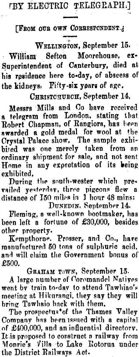 TBY ELECTRIC TELEGRAPH;] [FBOM OtTE OWH CDEEESPCNDENT .<{ Wellington, September 15. William Sefton Moorehouse, erSuperintendent; of Canterbury, died at his residence here to-day, of abscess of the kidneysi Fifty -six years oP age. CHBI9TC3UBCH, September 14. Messrs Mills and Co have received a telegram from London, stating that Robert Chapman, of Rangiora, has ben awarded a gold medal for wool at the Crystal Palace show, The sample exhibited was one mepely taken from an ordinary shipment for sale,, and not sent Home in any expectation of its being exhibited, During tlie south-wester which pre« vailed ye<»terdflv, three pigeons flew a distance of 150 miles in ] hour 48 mins: Dunedin. September 14. Fleming, a well-known bootmaker, has been left a fortune of £30,000, besides other property. Kempthornf. Prosser, and Co., have manufactured 50 tons of sulphuric acid, and will claim the Government bonus of £500. Graham town, September 15A large number of Ooromandel Natiyps went by train to»day to attend Tawhiao's meeting at Hiktirangi, they say they will bring Towhaio back with them. The prospecfus*of the Thames Valley Company has been issued with a capital of £400,000, and an influential directory. Itis proposed to construct a railway from Monrie's /ilia to Lake Eotorua under the District Railways Act.