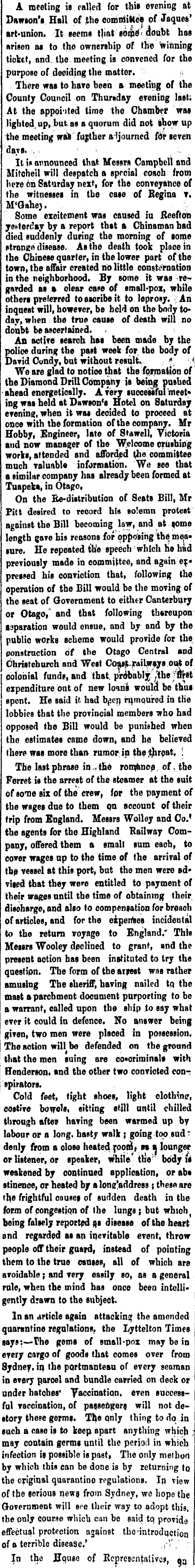 A meeting is railed for thi» evening at Dawion'i Hall of the committee of Jaques' art-union. It teems tliot boiJj^ doubt has arisen at to the ownership of the Winning ticket, and tbe meeting ia convened for the purpose of deciding the matter. >■; There was to have been a meeting of the County Council on Thursday evening last; At the appointed lime the Chamber was lighted, up, but as a qnorum did not ihowup the meeting was" fuf ther adjourned for seven days. •.. ■. ■■ ' ■■ : . ,;. It i« announced that Messrs Campbell and Mitchell will despatch a special coach from here 6ri Saturday next, for the conveyance of the witnesses in the case of Begina v. M'GBhej. Some excitement was caused iv fieefton yesterday by a report that a Chinaman had died suddenly during the morning of tome strange disease. As the death took place in the Chinese quarter, in the lower part of the town, the affair created no little consternation in the neighborhood* By some it was regarded as t> clear case of small-pox, while others preferred to ascribe it to leprosy. An inquest will, however, be held on the body to* day, when : the true cause of death will no doubt be ascertained. < . . An active search has been made by the police during the past week for, the body of David Oundy, but without result.. :*: ' We are glad to notice that the formation of the Diamond Drill Company is being pushed ahead energetically. A very successfurmeet* ing was held at Dawson's Hotel on Saturday evening, when it was deoided to proceed at once with the formation of the company. Mr Hobby, Engineer, late of Stawell, Victoria and now manager of the Welcome crushing works, attended and afforded the committee much valuable information. We see that a similar company has already been formed at Tuapeka, in Otago, On the Re-distribution of Seats Bill, Mr Pitt desired to record his solemn protest against the Bill becoming law, and at some length gave his reasons for opposing the measure. He repeated ttie speech : which tie had previously made in committee, and again ex* pressed his conviction that, following the operation of the Bill would be the moving of the seat of Government to either Canterbury or Otago, 1 and that following thereupon saparation would ensue, and by and by the public works scheme would provide for the construction of the Otago Central and Christcburch and West Co^.t railways out of colonial funds, and that, prdbablj /the n>Bt expenditure but of new loans would! be thus spent. He said it had b^en rumqured in the lobbies that the provincial members who had opposed the Bill would be punished when the estimates came down, and he believed (here was more than rumor in the ;thrpat. ! The last phrase in * the romance , of . the Ferret is the arrest of the steamer at the suit of sonae six of the crew, fpr the payment of the wages due to them pn account of their trip from England. Messrs Wolley and Co.* the agents for the Highland Railway Company, offered them a small sum each, to cover wages up to the time of the arrival of the vessel at this port, but the men were advised that they were entitled to payment of their wages until the time of obtaining their disoharge, and also to compensation for breach of articles, and for the expenses incidental to the return voyage to England/ Thhv Messrs Wooley declined to grant, and the present aotion has been instituted to try the question. The form of the aipest w»s rather amusing The sheriff, having nailed to, the mast a parchment document purporting to be a warrant, called upon the ship to say what ever it could in defence. No answer being given, two men were plaoed in possession. The aotion will be defended on the ground that the men suing are co«oriminalt with Henderson, and the other two convioted conr spirators. Cold feet, tight shoes, light clothtacr, costive bowels, sitting still until chilled through after having been warmed up by labour or a long, hasty walk ; going top sud ~ denly from a dose heated roofnV w a lounger or listener, or speaker, while* tbV body is weakened by continued application, or abt stinenoe, or heated by alone'address ; these are tb,e frightful causes, of sudden death in the form of congestion of Ihe lungs ; but which t being falsely reported as disease of the heart and regarded as an inevitable event, throw people off their guard, instead of pointing them to the true causes, all of which are avoidable ; and very easily so, as a general rule, when the mind has once been intelligently drawn to the subject. In an article again attacking the amended quarantine regulations, the Lyttelton Times says: — Ihe gems of small -pox may be in every cargo of goods that comes over from Sydney, in the portmanteau of every seaman in every parcel and bundle carried on deck or under hatches' yaccination, even successful vaccination, of passengers, will not destory these germs. The only thing to do in such a case is to keep apart anything which ; may contain germs until the period in which infection is possible is past, The only metbon by which this can be done is by returning \q the original quarantine regulations. In view of the serious news from Sydney, we hope the Government will ccc their way to adopt this, the only course which can be said tq provide effectua.l protection against the 'introduction of a terrible disease.' ,V. In the Hquso of Representative?, ga