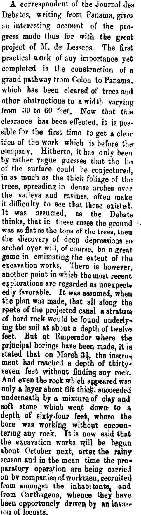 A correspondent of the Journal des Debates, writing from Panama, gives an interesting account of the progress made thus far with the great project of M, de Lesseps. The first practical work of any importance yet completed is tlie construction of a grand pathway from Colon to Panama, which has been cleared of trees and other obstructions to a width varying from 30 to 60 feer. Now that 'this clearance has been effected, it is pos»« sible for the 6rst time to get a clear idea of the work which is before the company. Hitherto, it has only bee<i by rather vague guesses that the lie of the surface could be conjectured, in as much as the thick foliago of the trees, spreading in dense arches over the valleys and ravines, often make it difficulty to see tfeat tkese existed. It was assumed, as the Debate thinks, that ie these cases the ground - was as flat as the tops of the treee, tlien the discovery of deep depressions e<> arched oyer will, of course, be a great game in estimating the extent of the excavation works, There is however, another point in which the most recent explorations are regarded as unexpecU edly favorable. It was assumed, when the plan was made, that all along the rpute of the projected canal a stratum; of hard rock would be found underlying the soil at abmt a depth of twelve feet. But qt Emperador where the principal borings have been made, it is stated that on March 31, the instrument had reached a depth of thirtyseven feet without finding any rock. And even the rock which appeared was only a layer about 6ft thief, succeeded underneath by a mixture of clay and soft stone which went down- to- a depth of sixty.fou? fe«^ where the bore was working without encountering any rock, It is now said that the excavation works wjll be begun, about October next, arter the rainy season and in the mean time the pre« parato.ry operation are being carried on by companies oi workmen, recruited from amongst the inhabitante^ and from Carthagena, whence they have been opportunely dnvea by an invaa* ion of locusts.