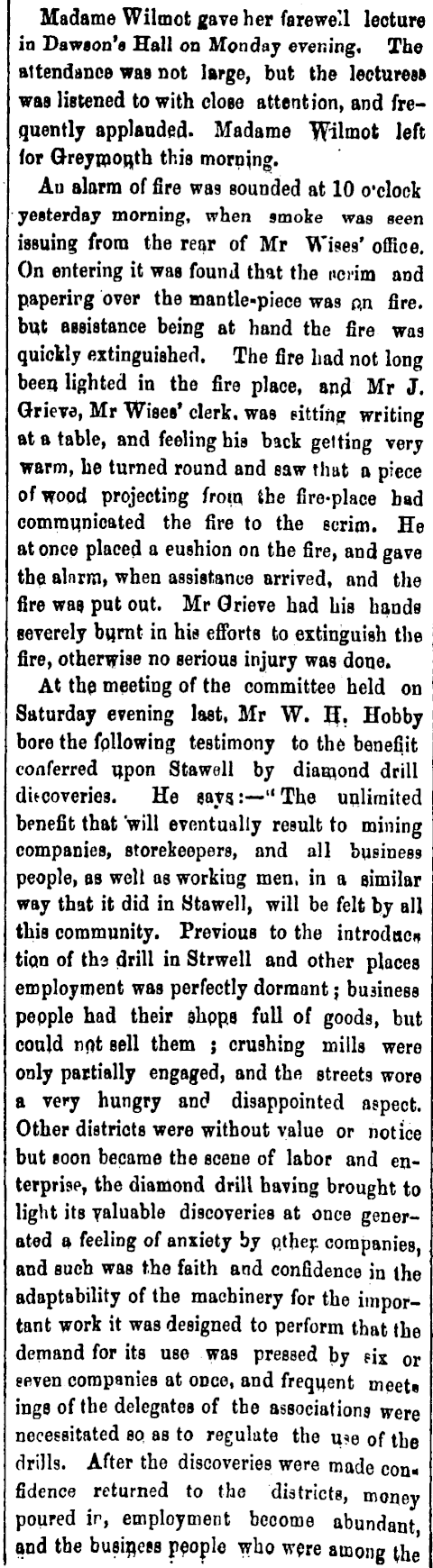 Madame Wilmot gave her farewell lecture in Dawson's Hall on Monday evening. The attendance was not large, but the lectures* was listened to with close attention, and fre- ■ quently applauded. Madame Wilmot left for Greymouth this morning. Au alarm of fire was sounded at 10 o'clock yesterday morning, when smoke was seen issuing from the rear of Mr Wises' office. On entering it waa found that the no-im and paperirg over the mantle-piece was an fire, but assistance being at hand the fire was quickly extinguished. The fire had not long been lighted in the fire place, and Mr J. Grieve, Mr Wises* clerk, was sitting writing at a table, and feeling his back getting very warm, he turned round and saw that a piece of wood projecting frotu the fire-place bad communicated the fire to the scrim. He at once placed a cushion on tbe fire, and gave the alnrm, when assistance arrived, and the fire was put out. Mr Grieve had bis hands severely burnt in his efforts to extinguish the fire, otherwise no serious injury was done. At the meeting of the committee held on Saturday evening last, Mr W. H. Hobby bore the following testimony to the benefjit conferred upon Stawell by diamond drill discoveries. He says:— " The unlimited benefit that will eventually result to mining companies, storekeepers, and all business people, as well as working men, in a similar way that it did in Stawell, will be felt by all this community. Previous to the introduction of tha drill in Strwell and other places employment was perfectly dormant ; business people had their shppa full of goods, but could not sell tbem ; crushing mills were only partially engaged, and the streets wore a very hungry and disappointed aspect. Other districts were without value or notice but soon became tbe scene of labor and enterprise, the diamond drill having brought to light its valuable discoveries at once generated a feeling of anxiety by qtbej*. companies, and such was the faith and confidence in the adaptability of the machinery for the important work it was designed to perform that the demand for its use was pressed by six or seven companies at once, and frequent meet* ings of tbe delegates of the associations were necessitated so, as to regulate the u?e of tbe drills. After the discoveries were made con« fidence returned to the districts, money poured ir, employment become abundant and tbe business people who were among the