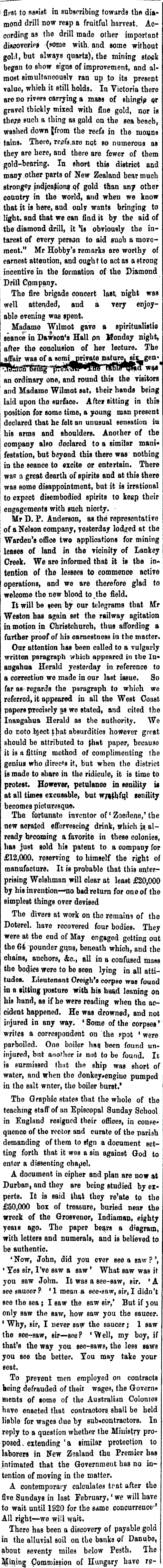 first to assist in subscribing towards the diamond drill now reap a fruitful harvest. According as the drill made other important discoveries (some with, and some without gold, but always quartz), the mining stock began to show signs of improvement, and almost simultaneously ran up to its present value, which it still holds. In Victoria there are no rivers carrying a mass of shinglp gr gravel thickly mixed with fine gold, nor is theje such a thing as gpld on the sea beach, washed down jfrom the reefs in the moans tains. There, reefs.are nqt so numerous as they are here, and there are fewer of them gold-bearing. In short this district and many other parts of New Zealand bear much stronge; jndjeaftong pf gold than any other country in the world, and when we know that it is here, and only wants bringing to light, and that we can find it by the aid of the diamond drill, it Ms obviously tbe interest of every person to aid such a movement." Mr Hobby's remarks are worthy of earnest attention, and ought to act as a strong incentive in the formation of the Diamond Drill Cpmpany. The fire brigade concert last night was well attended, aud a very enjoyable evening was spent. Madamo Wilmot gave a spiritualistic seance in Dawson's Hall pn Monday nigbt, after the conclusion of her lecture. The affair was of a Bemjjriyate nature, sit, gen« an ordinary one, and round this the visitors and Madame Wilmot sat, their hands being laid upon the surface. After sitting in this position for some time, a young man present declared that he felt an unusual sensation in bis arms and shoulders. Another of the company also declared to a similar manifestation, but beyond this there was nothing in the seance to excite or entertain. There was a great dearth of spirits and at this there was some disappointment, but it is irrational to expect disembodied spirits to keep their engagements with such nicety. Mr D. P. Anderson, as the representative of a Nelson company, yesterday lodged at tbe Warden's office two applications for mining leases of land in the vicinity of Lankey Creek. We are informed that it is the intention of the lessees to commence active operations, and we are therefore glad to welcome tbe new blood to, the field. It will be seen by our telegrams tbat Mr Weston has again set the railway agitation in motion in Christchurch, thus affording a further proof of his earnestness in the matter. Oar attention has been called to a vulgarly written paragraph which appeared in the Inangahua Herald yesterday in reference to a correction we made in our last issue. So far as regards the paragraph to which we referred, it appeared in all the West Coast papers precisely as we stated, and cited the Inangahua Herald as the authority. We do coto bject $ bat absurdities however great should be attributed to (hat paper, because it is a fitting method of complimenting the genius who directs it, but when the district is made to share in the ridicule, it is time to protest. However, petulance in senility is at all times excusable, but wnthfigl senility becomes picturesque. The fortunate inventor of ' Zoedene,' tbe new aerated effervescing drink, which is already becoming a favorite in these colonies, has just sold his patent to a company for £12,000, reserving to himself the right of manufacture. It is probable that this enterprising Welshman will clear at least £20,000 by his invention— no bad return for one of the simplest things over devised The divers at work on the remains of tho Doterel. have recovered four bodies. They were at tbe end of May engaged getting out the 64 pounder guns., beneath which, and the chains, anchors, &c, all in a confused mass the bodies were to be seen lying in all attitudes. Lieutenant Oreigh's corpse was found in a sitting posture with bis haftd leaning on his hand, as if he were reading when the accident happened. He was drowned, and not injured in any way. 'Some of the corpses' writes a correspondent on the spot • were parboiled. One boiler hag been found uninjured, but another is not to be found. It is surmissed that the ship was short of water, and when the donkey-engine pumped in the salt wnter, the boiler burst.' Tbe Graphic states tbat tbe whole of the teaching staff of an Episcopal Sunday School in England resigned their offices, in consequence of the rector and curate of the parish demanding of them to sign a document setting forth tbat it was a sin against God to enter a dissenting chapel. A document in cipher and plan are now at Durban, and they are being studied by experts. It is said that they re'ate to. the £50,000 box of treasure, buried near the wreck of the Grosvenor, Indiaman, eighty yeais ago. The paper bears a diagram, with letters and numerals, and is believed to be authentic. ' Now, John, did you ever see a saw ? ', • Yes sir, I've saw a saw ' What saw was it you saw John. It was a see-saw, sir. ' A see saucer ? ' 1 mean a see-saw, sir, I didn't see the sea ; I saw the saw Bir,' But if )ou only saw the saw, how saw you the saucer. ' Why, sir, I never sow the saucer ; 1 saw the see-rsaw, sir— see? 'Well, my boy, if that's the way you see-saws, the less saws you see the better. You may take your seat. To prevent men employed on contracts being defrauded of their wage?, the Governs ments of some of the Australian Colonies have enacted that contractors shall be held liable for wages due by sub-contractors. In reply to a question whether the Ministry proposed, extending 'a similar protection to laborers in New Zealand the Premier bas intimated that the Government has no intention of moving in the matter. A contemporary calculates tr- at after tbe five Sundays in last February, •we will have to wait until 1920 for the same concurrence-' All right — we will wa»t. There has been a discovery of payable gold in the alluvial soil on the banks of Danube, about seventy miles below Pesth. The Brining Commission of Hungary bave rp-