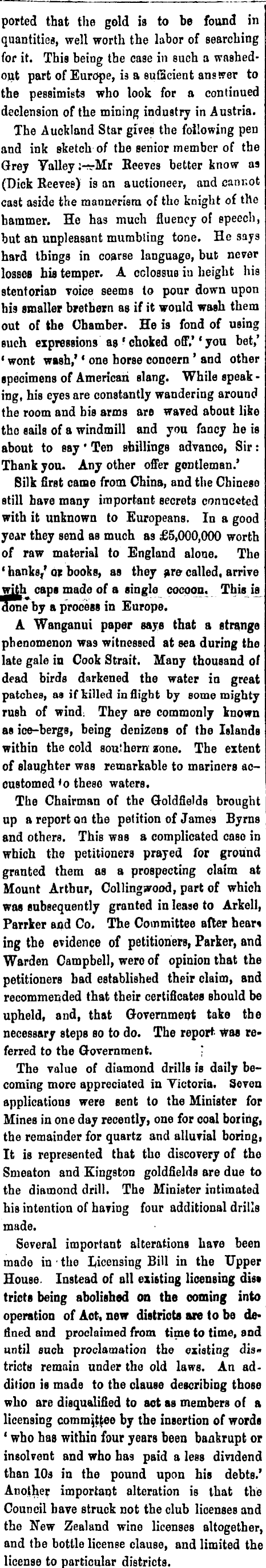 ported that the gold is to be found in quantities, well worth the labor of searching for it. This being the case in such a washedout part of Europe, is a sufficient answer to the pessimists who look for a continued declension of the mining industry in Austria. The Auckland Star gives the following pen and ink sketch of tbe senior member of the Grey Valley :-s.Mr Reeves better know as (Dick Reeves) is an auctioneer, and cannot cast aside the mannerism of tbe knight of the hammer. He has much fluency of speech, but aU unpleasant mumbling tone. He says hard things in coarse language, but never losses his temper. A colossus iv height his stentorian voice seems to pour down upon his smaller bretbern as if it would wash them out of the Chamber. He is fond of using such expressions as 'choked off." you bet,' • wont wash,' ' one horse concern ' and other specimens of American slang. While speak - ing, his eyes are constantly wandering around tbe room and bis arms are waved about like the eails of a windmill and you fancy he is about to say ' Ten shillings advance, Sir : Thank you. Any other offer gontleman.' Bilk first came from China, and the Chinese still have many important secrets connected with it unknown to Europeans. In a good year they send as much as £5,000,000 worth of raw material to England alone. The ' hanks/ or books, as they are called, arrive with caps made of a single cocoon. This is done by a process in Europe. A Wanganui paper says that a strange phenomenon was witnessed at sea during the late gale in Cook Strait. Many thousand of dead birds darkened tbe water in great patches, as if killed inflight by some mighty rush of wind: They are commonly known as ice-bergs, being denizens of tbe Islands within the cold southern zone. Tbe extent of slaughter was remarkable to mariners accustomed <o these waters. The Chairman of the Goldfields brought up a report on the petition of James By ras and others. This was a complicated case in which the petitioners prayed for ground granted them as a prospecting claim at Mount Arthur, Collingwood, part of which was subsequently granted in lease to Arkell, Parrker and Co. The Committee after hear . ing the evidence of petitioners, Parker, and Warden Campbell, were of opinion that the petitioners bad established their claim, and recommended that their certificates Bhould be upheld, and, that Government take tbe necessary steps so to do. The report was referred to tbe Government. The value of diamond drills is daily becoming more appreciated in Victoria. Seven applications were sent to the Minister for Mines in one day recently, one for coal boring, the remainder for quartz and alluvial boring, It is represented that tbo discovery of the Smeaton and Kingston goldfields are due to the diamond drill. The Minister intimated his intention of having four additional drills made. Several important alterations have been made in - the Licensing Bill in the Upper House. Instead of all existing licensing diss tricts being abolished on the coming into operation of Aot, new districts are to be de* fined and proclaimed from time to time, and until such proclamation the existing districts remain under the old laws. An addition is made to the clause describing those who are disqualified to act as members of a licensing committee by the insertion of words ' who has within four years been bankrupt or insolvent and who has paid a less dividend than 10s in the pound upon his debts.' Another important alteration is tbat the Council bave struck not tbe club licenses and the New Zealand wine licenses altogether, and tbe bottle license clause, and limited the license to particular districts.