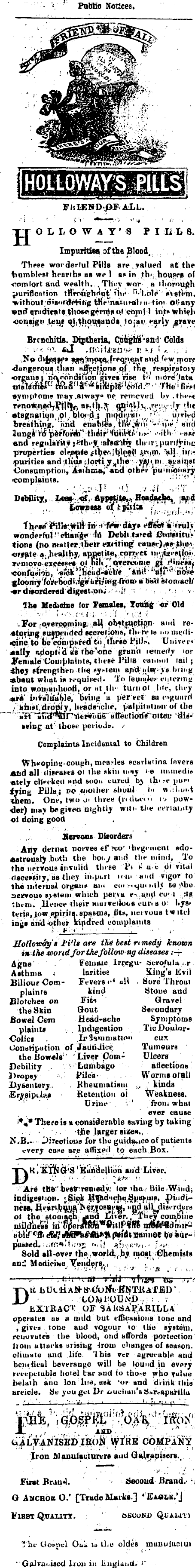 - \ ' Pofctio Notices. FhIEND.p^AiLL. Tj- OLLO WA V ' S PIIi tB. Impuritass of the Blood. Thpse wordeHul Pills are, valued at the humblest hearths us we 1 a« in ,th>j housrs of -comlprt arid wealth.. . They wnr a thorough tttrooehriu't m»i* ■ vVatPin. •without;ois'>»'drtifig tKe ; nalnralMi; tim o'/any. »nrf e.mdirate. tho««g*rTrtii o,f cojii! 1 intf> which •consign .tei)( Qj,thqu^unds .tojav •'arly grave. Brcnchitis. IHptheria, Cpugh^'-anil Colds 21* di|efl|f » f^fmoji^freqj^nf and lew more ■dangerous , tliflii afffjet ions pf . the, t respiratoi y orcans j no, ro'ndit'ion gives risfl i<"> more'lata »ymptomi> may .ai-way" ne removed by . th«*i*e renow^eAPfllV) a^tfj,^ Atyfy,rejty-.ly:-» ; !ie «tß(;naiii}n ,01^ blofd ; nujdnrui. 4t; • urrird ■breathing, "juid enables flW^wVii * 7 - 1 ' \'{>e - hHW aungit^^efforA"' tliei^HtoiM^- .-ilh ■• .use and regiilßY«V;Slh.'^;al'saih; tin ir-pun/yiiii; properties oli-^n<e f theft , ; b,l(>«^ %H, . iif s - f>urities and !tK«u» j lorti y^the • y^Mn. suainst Consumption, A*ihnia,"and other puiiiioiiary •complaints. " ; " '' .' DAility,, L«a-^<rf ? Apj^te« Bt *4*fit\ i?¥?4 Lcrvsus of >puita i ' . ihete W^.fi^ia- rf^fi^r days e«fee»i;/rulV' wonderful change In Debii ta»ed Corjeiitu*! tione (no. m»lier;i6eir eliiting raiwr). ( «^ t tili«.\; •orpate •..hesaihy, apMlit« v cpr^ct iii'.^er^pr^ Temove excess*; oi ,hik f "*^Terw'nie gi.'.dinesaV* «onfusioii, l fwik*:h6ttd 1 -* cb l « 'anil' W' tf '-tfoVe 1 n-dtt» a b«l ston/ach 1 >«r disordered digest. on; , >.]? ■ ; , - .:■ •/-•- 11m lledieine for Females, Young -or Old •.ForjOyercpfningj:^ ob«t|U,etion- and re«tpring ouspt-nded secret:on», th. re is m> niedi«ine.'to jbeijoniptired't'o^tupse PilJ^ Univer* daily ndopt< ! 'd rfs tne- v one gran'cl lemedy 'or female Complaints, these J'iliß cuniiot tail ; ihey airengthen ~tU« ny^tem ajid i.l«? -ye In ing abaut what i« N-quii>eil. To ieM>i>W- eiiierinjj into womanhood, or utth' turn of hit-, they *rt' yiiaiuable, being 'a per>i't su i-^unrrt /«hi»t, dropsy, heads-Vche, palpiiuiu>ivof the ■ ""'•''»W^l!^%n»ir%iu6~"afl!ectidiW : *olteß "di«-*l kHDg at' those periodt. ■■ Complaints Incidental to Children Wh«opina-cougli, measles scarlatina fevers «Dd all (fißra»B Ollhe «kiu n>«iy '-c iimnedic «tely cH<*<-ke(l »i>d soon cured b} thi re pun iying Pills j i»o «i<)thei shoul In w.ti.ui.t uiem. One, two di three (iidiic-i" i^> pow■def) may be given nightly witi. the .•ertaiiit.y oi doing good Kerv«oß Diiorders Aliy dernat nerves cf ?co' 'hegement sdoAstreusly both the boc.^ and the mind, To the nervous invulid three P« vl ueo'i vital clece*BJty, as they iii.puit urn «nd vigor to Ihe internal organ* am cm >«gui iill< to j^-be aeevous g\*teni which pei.va e-,uii}l co> I its. :briu. HeiKje their mai veiloce i-urt so: l.ys» terie.JLow spirits, spasms, lits, nervous tvitcl ings ami -other kirtdred eouiplaiuts Hotlotcoy s vlti'ls are the best nmedy known in ihe tcondfor the follow ng diseases :~ Agne - Female Irregu- Scro/ulu . r Asthma larities King's Evil Siliour Com- Fevers « >4 oil . Sore Throat plaints kind Stone and Blotches on Fits Qravel the Skin Grout Secondary Bowel Com Head-ache Symptoms plaints , Indigestion TicDoulorOolici . ir?U»nnitttio« eux Constipation of JadnJice Tumours theßow«ls ! Liver Com- Ulcers Debility . '"Lumbago - anectiooa Dropsy :. Piles- . Worms offlli JJysentory . Kheuniatisin .., , kinds Erjsipultw Retention oi Weakness, Urine- . • ' fronj what ever cause > # «* There is a considerable saving by taking . . ■ ■. tfte larger size*., N.B.- Directions for the guidauce of patients c-very case are affixed . to each .Box. ~pv X ', X& Gr'S ' Eah'deUion an d Liver. Are the-' bestrrentedyj lor 'ha/ Bile -Wind; indigestion. ;,Sip v k Hffcd'tcJioSpafui?, nees, Heiri^ujft ]N^|OBn^w, nnd ail^distrtlers pi the. stomach Jind Liver. They combine niildness iriMerfl^^itlf'f W ntWt^dmir'ablircift AnMßnLsA*%p*iAtV&miOt be^ur- f pawedr:r;rn*»ft.:'»i ".Jj 4h--?.-f.-tn . ■■ t'>' Sold all -over the by niosttShemists ani Medicine Vend^rSr! '.. , , : , r ■ •„[ " — ■ ', ti-'i >! v lit — r'-itj vf u «IPI 05 — 7T'\ DIC b OCH AM- » tfolfl; MNTltAllSD " LOiVU'ptliVrD; }■ . ■: JiXTBAC 1 ; OF SA KSAPABILLA operates us a mild but efficuaions tone and , gives . tone aud vogour to the system, reuuvutes tbe blood, ond affords ported ion Itom attacks urisiiig -frou) changes of season, oliuiute and life. 'Ibis ver agreeable and bemiicul beverangc will be lound in every reeepciable hotel bar uad to tho-e who yalue belnth ano lon lua, aek 'or and di ink this article. Se you gel Dr ijucliun's SuriapaHUu Jl j' '.'.•. Ajp . . / ■ ■■■ ,"* ' "! Wfnt COMPANY Iron Manufacturers aud QaUapisers., . : ; "~."" '. . .>i...; ./ ■ Firat Brou4. * ' Secoud Brand/ •; G Amchob O. [Trade M*rks.] ♦ EAans.'j ¥lEBT QUALITT. : OBCOND QtAUai "he Go»i>«l Ouk io the oldes manuluciui * ;■ <■ • i " GaJrai-iaed Iton in tnglui.tl. '•' j