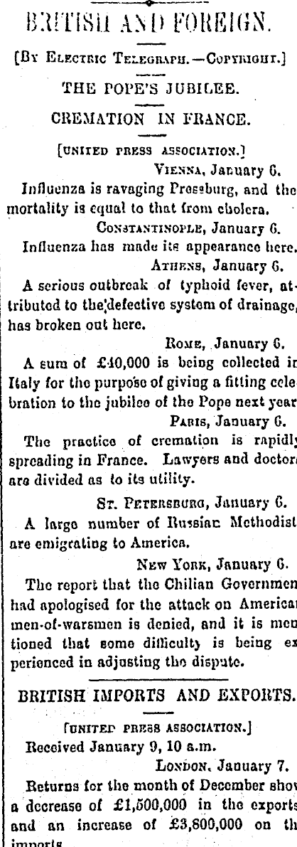 nmm amTfohfjgn. [By Electbic Telegraph.— Copymout.] | THE POPE'S JUBILEE. CREMATION IN FRANCE. [united mESS association.] Vienna, January 0. Influenza is ravaging ProEsburg, and the mortality is equal to that from cholera. Constantinople, January 6. Influenza haa mado its appearance here. Athens, January G. A serious outbreak of typhoid fever, attributed to the)defective system of drainage, has broken out here. Rome, January C. A euro, of £10,000 is being collected m Italy for tho purpo'so of giving a fitting colebration to tho jubilee of tho Pope next year. Paris, January C. Tho practice of cremation is rapidly spreading m France. Lawyers and doctors ara divided as to its utility. St. Petersburg, January G. A largo number of Russian Methodist: are emigrating to America. Nbw York, January 6. The report that tho Chilian Govornmen had apologised for the attack on Americar inen-of-warsrnen is denied, and it is men tioned that some ditlicult) is being ex pcrienced m adjusting tho dispute. BRITISH IMPORTS AND EXPORTS. PONITET PBBSS ASSOCIATION.] Received January 9, 10 a.m. London. January 7. Returns for the month of December Bhovt a decrease of £1,500,000 m tho exports and an increase of £3,800,000 on tin imDorts.
