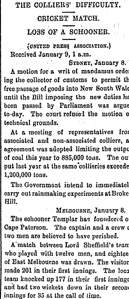 the colliers 1 difficulty. cricket match, loss op aTchooneb. (ONTTED PHESQ ASSOCIATION.) Received January 9, 1 a.m. Sydney, January 8. A motion for a writ of mandamus order iog the collector of customs to permit th free passago of goods into New South Wale until tho Bill imposing tho new duties ha been passed by Parliament was argue to-day. The court refasod the motion oi technical grounds. At a meeting of representatives Iron associated and non-associated colliers, ai agreement was adopted limiting the outpu of coal this year to 885,000 tons. The out put last year at the same 'collieries exceeds 1,200,000 tons. The Government intend to immediately carry out rainmaking experiments atßrokei Hill. Melbourne, January 8. The sohooner Templar has foundered of Cape Patorson. The captain and a crew o two men are believed to have perished. A'match between Lord Sheffield's team who played with twelve men, and cighteei of East Melbourne was drawn. The visitor! made 201 m their first innings. The loca team knocked up 177 m their first innings and had two wickets down m their second innings for 35 at the call of time.