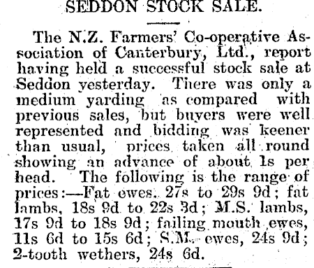 SEDDON STOCK SALE. The NiZ. Farmers! Go-opera,;tire Association of Canterbury, Ltd., report having held a successful stock sale at Seddon yesterday. There was only a medium yarding as compared with previous sales, but buyers were well represented and bidding was keener than usual, prices taken all round showing an advance of about, Is per head. The following is the range of prices:—Fat ewes;. 27s to 29s 9d; fat lambs, 18s 9d to 22s 3d; M.S. lambs, 17s 9d to 18s 9d; failing mouth ,ewes, 11s 6d to 15s 6d; ft;iVl. ewes, 24s 9d; 2-tooth wethers, 24s 6d.