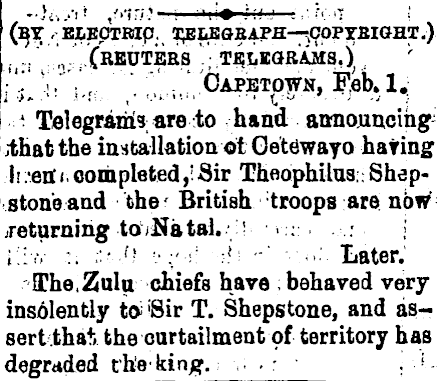 -■iisA* t w,i.: -Mlm.r.'j .--k-'i i (^Y, .: EIBOTBip. (i ... rl . ; . (REUTERS "'; jVffcKQß&lka,^ s '' 1 Telegrariigare to hand announcing jthafc the installation ot GeteJwayo hating li en* i. completed ," Sir Theophilus.. Shepstonoand the' British troops are now returning Ui /Natal. ' ■■»■.-::. • j iii-.v .: ; ;:• f ! ■■- : f :?' -" - -: Later. The. Zulu chiefs have ; behaved very insolently to ' Sir T. Shepstone, and assert that the curtailment of territory has degraded rb'e-kinjEf. ; ■.:• .■' -,