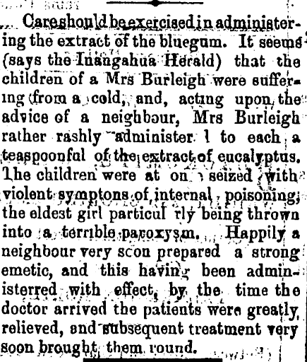 ••-..'.' -JiCo-.'i-i • ?•■ «... QarMhpJi&bas^^ t ing the extract of the bluegnm. It seetpg j (says the Iria'hgahua Herald) that the children of a Mrs Barleigh were BtiflEejringc6roma.!cold;vand, acting upon, the: advice of a neighbour, Mrs Burleigh rather rashly "administer. 1 to each ; a ;teasDoonfal o^thej extract; of, eucalyptus. Ihe children were at ott'V'seiEßot /^rith>iviolentsy/nptonsipf, internal ? po^sdmngf the eldest girl particut rlyVeing thrown into ;a tdmbleipajßpxy^jm. ■ JEUppilyj a neighbour very scon prepared a strong: emetic, and this haVin^ been adminw; isterjed-;With .e^ectj by .tbe^ time the doctor "arrived the patients were greatly, relieved, end 'subsequent treatment very ffppn jhrqughjtj them, round. .. _. iv/ , .. q , J