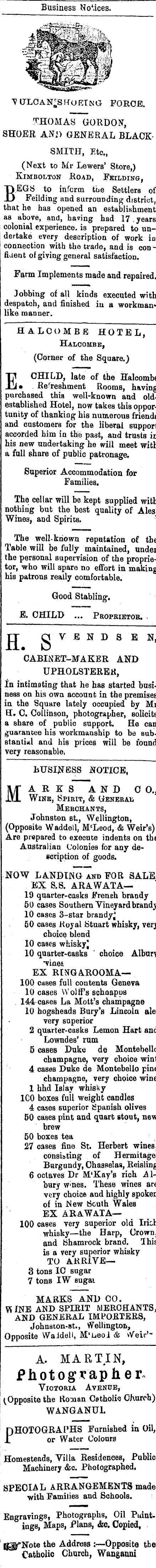 Business NoMces. WLOAN^SFfOETNG FORCE. THOMAS GORDON, SHOER ANi) GENERAL BLACKSMITH, Etc., (Next to Mr Lowers' Store,) Kimbolton Road, Feilding, BEGS to inform tLe Settlers of Feilding and surrounding district, that he has opened an establishment as above, and, having had 17, years colonial experience, is prepared to undertake every description of work m connection with the trade, and is con - fluent of giving general satisfaction. Farm Implements made and repaired. Jobbing of all kinds executed with despatch, and finished iv a workman* like manner. HALCOMBE HOTEL, Halcombk, (Corner of the Square.) E CHILD, late of the Halcombe • Refreshment Rooms, having purchased this well-known and oldestablished Hotel, now takes this opportunity of thanking his numerous friends and customers for the iiberai support accorded him m the past, and trusts m his new undertaking he will meet with a full share of public patronage. Superior Accommodation for Families. The cellar will be kept supplied with nothing but the best quality of Ales, Wines, and Spirits. The well-known reputation of the Table will be fully maintained, tinder the personal supervision of the proprietor, who will spare no effort m making his patrons really comfortable. Good Stabling. E. CHILD ... Proprietor. IT O V JS N D S E N, CABINET-MAKER AND UPHOLSTEREK, In intimating that he has started business on his own account m the premises m the Square lately occupied by Mr H. C. Collinsou, photographer, solicits a share of public support. He can guarantee his workmanship to be substantial and his prices will be found very reasonable, BUSINESS NOTICE, MARES AND CO., Wine, Spirit, & General Merchants, Johnston Bt., Wellington, (Opposite Waddell, M'Leod, & Weir's), Are prepared to execute indents on the Australian Colonies for any de•cription of goods. NOW LANDING and FOR SALE, EX S.S. ARAWATA— 19 quarter-casks French brandy 50 cases Southern Vineyard brandy 10 cases 3-star brandy^ 50 cases Royal Stuart whisky, very choice blend 10 cases whisky) 10 quarter-casks ' choice Alburv *viaet EX RINGAROOMA— 100 cases full contents Geneva 10 cases Wolff's schnapps . 144 cases La Mott's champagne 10 hogsheads Bury's Lincoln ale, very superior 2 quarter-casks Lemon Hart and Lowndes' rum 5 caseß Duke de Montebello champagne, very choice wint 4 cases Duke de Montebello pine champagne, very choice wine 1 hhd Islay whisky ICO boxes full weight candles 4 cases superior Spanish olives 50 cases pint and quart stout, new brew 50 boxes tea 27 cases fine St. Herbert wines, consisting of Hermitage, Bargundy, Chasselas, Reisling 6 octaves Dr M'Kay's rich A l--bury wnes. These wines are very choice and highly spoken of m New South Wales EX ARaWATA— 100 cases very superior old Irich whisky — the Harp, Crown, and Shamrock brand. 2 his is a very superior whisky TO ARRIVE— 3 tons IC sugar 7 tons IW Bugai MARKS AND CO. VS INE AND SPIRIT MERCHANTS, AND GENERAL IMPORTERS, Johnston-st., Wellington, Opposite Waideli, M'beol & vVeir'A. MARTJN, Photographer, Victoria Avenue, Opposite the Koxan Catholic Church) WANGANUL PHOTOGRAPHS Furnished m Oil, JT or Water Colours Homesteads, Villa Residences, Public Machinery &c. Photographed. SPECIAL ARRANGEMENTS made with Families and Schools. Engravings, Photographs, Oil Puint. ings, Maps, Plans, &c. Copied, ggg"Note the Address : — Opposite the Catholic Church, Wanganni