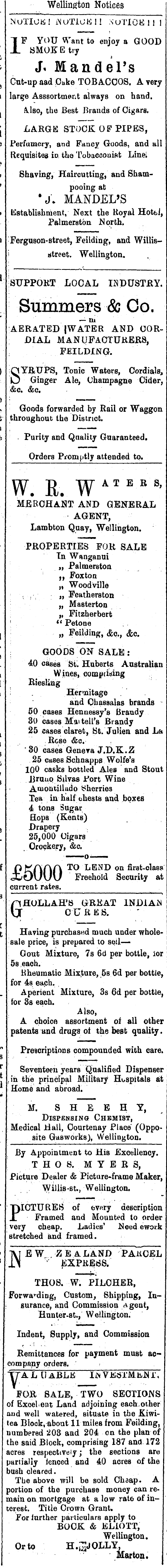Wellington Notices NU'llUfci! iNuTIUKI! NoTICU 1 ! I IF you Want to enjoy a GOOD SMOKE try t ' t J< Man d el's B Cut-up aad Cake TOBACCOS. A very i large Asssortmar.t always on hand. . Also, the Best Brands of Cigars. J LARGE STOCK OP PIPES, b Perfumery, and Fancy Goods, and all Requisites m the Tobaccoui&t Line! ? _____ » Shaving, Haircutting, and Sham- ' pooing at V. MANDEL'S » Establishment, Next the Koyal Hotel, Palmeratbn North. a Ferguson-street, Feilding, and Willis— i street, Wellington. i iSTJPPORT LOCAL INDUSTRY. Summers & Co. — m AERATED JWATER AND CORDIAL MANUFACTURERS, FEILDING. ) ;QYftIJPS, Tonic Waters, Cordials, IO Ginger Ale, Champagne Cider, &c. &c. v Goods forwarded by Rail or Waggon t throughout the District. b . Purity and Quality Guaranteed. Orders Pfonifjtly attended to. W. ft. W ATEES ' MERCHANT AND GENERAL AGENT, Lambton Quay, Wellington. PROPERTIES FOR SALE In Wanganui „ Palmerston Foxton „ Wopdville . . „ Featherston r „ Masterton ; „ Fitzherbert 1 " Petone j „ Feilding, &c, <fee. ] : GOODS ON SALE: 40 cases St. Huberts Australian i Wines, computing I Riesling $ ; . Hermitage . and Chaßsalas brands 50 cases Henuessy's Brandy 30 cases Mattell's Brandy 1 25 cases claret, St. Julien and La 3 Rose &c. 3 30 cases Geneva J.D.K.Z t 25 cases Schnapps Wolfe's 100 casks bottled Ales and Stout 8 J3ruuo SUvas .f ort Wine Amontillado Cherries Tea m half chests and boxes 4 tons Sugar Hops (Kents) B Drapery 25,000 Cigars Crockery, &c. f n KAfiA TO LEND on firafc-class obOUUU Freehold Security at current rates. 8 pHOLLAH'S GREAT INDIAiN XJ CURES. t Having purchased much under wholesale price, is prepared to soil — Gout Mixture, 7s 6d per bottle, lor 5s each. Rheumatic Mixture, 5s 6d per bottle, for 4s each. Aperient Mixture, 3s 6d per bottle, tor 3s each. Also, A choice assortment oi all other patents and drugs oi the best quality. n ; Prescriptions compounded with care. r Seventeen years Qualified Dispenser * r in the principal Military Hospitals at Home and abroad. M. S H E E H V, Dispensing Chemist, Medical Hall, Courtenay Place' (Opposite Gasworks), Wellington. By Appointment to His Excellency. THOS, MYERS, Picture Dealer & Picture-frame Maker, Willis-st., Wellington. ' T>ICTURES of evftry description JL Framed and Mounted to order very cheap. Ladies' .Need e work stretched and framed . > ; j • IV I E W 7i E A LAND PAIiCEL 3 I>| '■■'• EXPRESS. THOS. W. PILCHER, Forwarding, Custom, Shipping, In- : surance, and Commission Hunter-st., Wellington. Indent, Supply, and Commission Remittances for payment must accompany orders. TTAL 17 ABLE IiNVJ-dTMhiNl', FOR SALE, TWO SECTIONS of Excel ent Land adjoining each. other and well watered, situate m the Kiwitea Block, about 11 miles from Feilding, numbered 203 and 204 on the plan of the said Block, comprising 187 and l72 acres respectively; the sections are partially ienced and 40 acres of the bush cleared. The above will be sold Cheap. A portion of the purchase money can remain on mortgage at a low rate of interest. Title Crown Grant. For iurther particulars apply to BOCK & ELIOTT, Wellington. Orto H.^JOLLY, Marton.