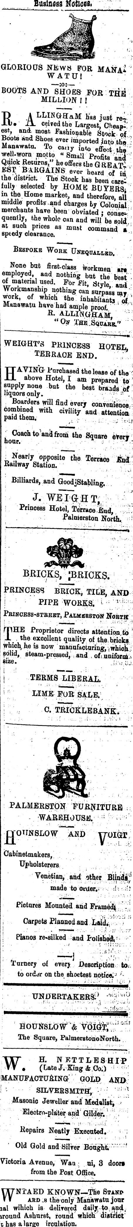 GLORIOUS NEWS FOR MANA* ' WATUi BOOTS AND SHOES FOR THE 1 MILLION I I RA LLIKGHaM Has just rel" • fiL ceived the Largest, Cheap-' - est, and mosh Fashionable Stock. o| Boots »nd Shoes ever imported gntptho ; Manawatu. To cany into effect the" well-worn motto « Small Profits and ■ Quick Returns,," he oflfers the GRE A T 1 EST ; BARGAINS; ever he«d of id ' the district. The Stock has beeii care:' fully selected by HOMK BDYERSin the Home market, and therefore all middle profit? .arid charges by Colonial merchant* have been obviated j conse* quently, the whole can and will be sold at such prices as must command »" speedy clearance. ! Bespoke Work Unequalled. : None but first-class workmen an employed aad j nothing but the best ■ of material used. F6r Fit, Style,; and Workmanship nothing can surpass my ': work, of which the! inhabitants of ' Manawatu have had ample proof ' ' R. ALLINGHAi^ : " On The^Squabe.' 7 WEIGHT'S PRINCESS HOTEL TERR ACE END. ( ' ITAVING Purchased the lease of the • JL above Hotel, I am prepared to v supply none but the best braids of liquors only. •• . Boarders will find every convenience: combined with civility and attentionpaid them, . ... , . ...... —;. ' Coach to'an^ from i the Square everr noun- . : ..- .••.•■■ . ■ ,■ ■■■. ■■• •; ■ : • ■■:*■'. \ Nearly opposite the Terrace JKnd" Railway Station. ; Billiards, and GoodjStablmg; ■'■': J. WEl^fiT; i " •; Princess Hotel, TerraceJnd, Palmerstoa North. ; . . . ' : .- , - . . ' ""I 11 ) 1 ,;. i«« ■ BKIOKS, JBRIC^S. : PRINCESS BRICK, TILE, AND ! PIPE WORKS, i 1 !- Princess-street, Palmsrston Nort* rnHE Proprietor directs attehtidm to >'' X the excellent quality of the. bricks which, ke is now manufacturing, twhicK; solid, steam-pressed, , and . of t uniform S ' "' .H'^.QJ. j TERMS LIBERAL. <•;;; LIME FOR SALE.; i ; a TRICKLEBANK. PALMERSTON FURNITURE ; - WAREHOUSE. :: : - : nroTrNSLow and ttoigt; Cabinetmakers,/ - Upholsterers, - Venetian, and; «>ther Bliadap made to order. ;-. . <.b. -mU Pictures Mounted and Framed* i ;! Carpets Planned and Laid.v \ Pianos re-silked and Polished ' Turnery of every Description to!: to ordjr on the shoetest noticed J ' : UNDERTAKERSI^ . <f ?^ ; ':'? itouNSLb#> voidr;;:; 3orit The Square, PalmerßtonoNorth. . WE. NETTLES HIP • C Late J. King &Co J * MANUFAOTURING GOLD Asjy ! - sdlveksmith; .'-. ; ;l \* Masonic Jeweller and Medalist, V Electro-plater a^ GiWer.^ ; ' Repairs Neatly Executed. j " Old Gold and Silver Bought ' f Victoria Avenue, Wav . ni, 3 doort from the Post Oflicei WNTAED KNOWN— Tfie Stand ard.B the only Manawatu jour nal wihich is delivered dajly to and, around Ashurst, round which district k has a large ircalation.