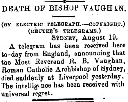DEATH OF BISHOP VAUGHAN. (by electric telegraph. — COPYBiam.) (rßuter's telegrams.) Sydney, August 19. A telegram has been received here to-day from England, announcing that the Most Reverend R. B. Vaughan, Roman Catholic Archbishop of Sydney, died suddenly at Liverpool yesterday. The intelligence has been received with universal regret.