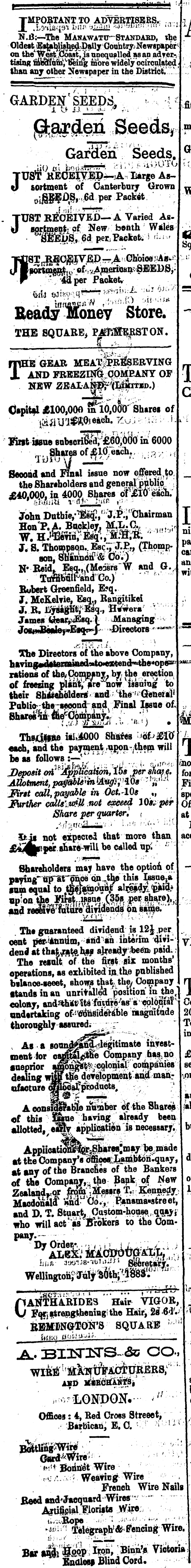 f hi. M if.i.. i.. . '.1.7 .jiytruTiTi i i '•- IMPORTANT TO ADVERTISERS.; .'., .Lswiaqei "brtJ* x.y.\'X w-'jmty- a- :•.' • •<• ••■ N.jJ:— The MAHAWATn^STANDABD, the OldeitEiJ^ljlisj^PailyGou'ntryiNewsiaper' on tke* W^. .Coastj is unequalled, as an adyer-, : tising &OTum, v 'Deing more widely bcirculated . than any other Newspaper in the District. " ' GARDEN SEEDS, >• ! * Garct'eii Seeds. - .yonlimd-ffirßH av'i f -iivO'lO JUST KECEiyED— A Large Assortment of Canterbury Grown & lPf^d per Packet JUST KEOEIVEI)— A Varied Assprtmentof New behth Wales nSSW^7S&. petPackefc '■! n- ' T^BT^BCjfIVEI>TTT,AHOhbi«rjAB.i* J Pjwrw^jo^ Jti A^!«citon^EEDSjr * .44 per Packet, ■M#ty\*^**™;£T;i'*°* _ ■■■-\B^6#.7^y i y* Ready Money Store. THE SQUARE, Pi!KI£E.RST ON . -.. . ■ f Ax :> _ ■■ - " ■ ... <«H^;...-,7 rE GEAR MEAT|wSsERVING AND FREEZQ^GQMEANY OF NEW ZEALA^>'(LiKITiiD.) Capital £100,000 in 10,000" Sharei of ' $a\j'ffi&^ r^777A.). First issue subscribVd, £60,000 in 6000 „, , Shares of £1$ each, .., ■ P . , , < lt)i*jy '<'-' '• •■ • Second and Final issue now offered, to the Shareholders and general public, £40.000, in 4000 Shares ofXIO each. ■ ' tm'tiU *"<H'' -*"*"* «" r " ; ! John 2>tttbie,*^Bs, ti iT.^.i'tlhairman Hon P. A. Buckley, &L.Q* ..,,;, J. S. Thompson., Esq., J.P f , (Thomp* son, Gannon s 's CoJ) N* Reid, EBq.„(Me3Brs"W and G., ( Tum*U u andt!o.) r Hubert Greenfield. E?q. J, McKelvie, Esq., Rangitikei J. R. l!fyiagKtf Esq., Ht/#era - James Oear,wEsq. l Jianaging ■■•<•■ : JosMtßeatef^Esq^l^ vDireotora *"«• .rt' iV, .....i. • ■ The Directors of the above Company, bavmgtdateaniaeoUt'toea^ rations of the^Cpmmmy, by the erection of freezing plantj jire^now issuing to their Shareholders and the' General 1 Public the second and Final Issue of. Thß<l|fne isi.4ooo Shares of £10 each, and the paymimt fUpon^them will he aa. follows &-»*** *^_ 7 '7 ..,'■. >»;.," YDeposit (ni^ppficationSib* for «J.a;,f." jßiintf call, payable in Oct. 10s „ TFurther calU'.will not earned 10s. per Share per quarter, f /■/^woa-iiv;**' i..!-- *■-,'' srii not expected that more than £ijih!per sbare-will be called up. - Shareholders may have the option of payfag-nTdH^ce oj tte thjs lssue^ sum equal to ffieJaAaonnj; alr^dyMpaul? and reewwrature dividends on same. V <\"A' : 7 ','...•.;■.•• »'< The guaranteed dividend is 12 J per oent per?anntim, and an interim dividend at that^^hai already 'been, paid. f • The result of the first sii- months operations, as exhibited inthe published bslanoe-seeet, shows tha^the/ Company •tanda in an unrivalled position in the, colony, and^hielts'futdre-'as- a undertaking of^cohaidel-able raagriitude thoronghly-asanredi , As a BOund^snC^legitimate investment for cappal^tn'e Company has no aueprior «ph^t-y colonial companies dealing wM the development and manofaetnre Mb^^pwdubts, 7A consumable number Pf the Shares of this 1&>« hann^ v already been •Hotted, ealrty application is necessary. Appiicado^^r-Shares>ay be made at the Company's dffipeflL.Lambtoh.quay, at any Ofthe Branches of the Bankers of the Company,^ the Bank, of New Zealandyqr from "jftessra. T ?i Kennedy; Macdonalor nnd" Co.,. Panama-street, and D. T. Stuar^ Custom-house, qoayj who will act 'as Brokers to the Company.— "^J^'-W^^U! hiift- luyiiwraisrt S&retery. 7\ Wemngton^^*i^^ *" ,-.-•, T r-. C" ' jgc-rai"7o .i • t « t >-»i»y ANTHARIDES Hair VIGOR, Fptj strengthening the Hair, 2s 1 6'l y . toMJBNOiJO^'S SQUARE ' !i h»tn fiotju^- '•-' . • ■■ ■ ■■•-;: jfiL.BHsrisrs-&; 00, WIRB h ift^t^^#^ 8 / L ISO "rfaßCtfAStS, /; Offices : 4, Red Cross Streeet, .^Barbican; E.G. ' : 7 '-YAl^ Tjlitim^y • ■'"7777 [ 7 Ctod^Wire"'- • iM ! t Boiinet Wire ■x-axT. WeavinjgWire : ' French Wire Nails Beed and* Jacquard -Wires ! • — AftiSoial Floriits flu* u,-:sßope. -'y" 7^y ; — rT'" . *ibAA\ Telegraph AV Fencing Wire. Bar ® n^ Victoria; V^ EnOlesi Blind Cord.