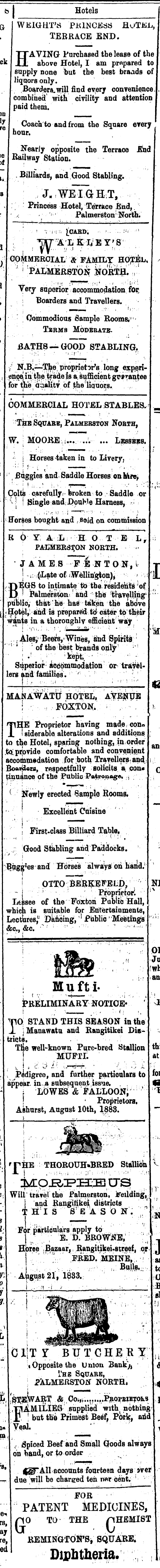 I Hotels WEIGHT'S PKINCEBS HoTEL, TERRACE END. HAVING Purchased the lease of the above Hotel, I am prepared to supply none but the best brands of I liquors only. Boarders. will find every convenience, combined' with civility and attention paid them. Coach to and from the Square every hour. Nearly opposite the Terrace End Railway Station. . Billiards, and Good Stabling. ( J.7WEIGM7I!, Princess Hotel, Terrace End, . a a - t Palmerston 1 North, j •'•■•■ -Xi-yy £CABO' ■■■ •'•■ - : ' ! ' { j COIjIMEROIAL ■'■"* FAMILY HO£EL, ' PALMERSTON NORTH. Very superior accommodation for ; Boarders and Travellers. ! " Commodious Sample Rooms-"' j Terms Modbbatb- ' \ BATHS -i GOOD STABLING. / N.B.—^e, proprietor's long experien^in the trade is a, sufficient gnirantee for the aaaiity of jthe liquors. COMMERCIAL HOTEL STABLES. •* The Squabe, Palmebston Nobth, W. \ MQOREyi...:-.-.. 7 .-' ... Lessees. : : j Horses taken in to Livery, ' ' t Buggies and Saddle Horses on fore, Colts carefully-' broken to Saddle or "-^l ! Siugle and: DpuHe Harness, .-..' Horses bpught and Sold on commission R 0 Y: A L H O T E L r FAIJMBRS^ON NORTH. ■ J AMES FENTON,! I ; ; (Late of f Wellington), ■> 7 BEGS to intimate tb tbe reßidehts of - Palmerston and the travelling public, that he has taken the above < Hotel, and is prepared tip' cater to their wants in a thoroughly efficient way ** j 7<i-uA. ;. •-.!', -"- " v "-■•-'•• ■■ •■■ ; A les; 1 Beers,' Wines, and Spirits : '"'"' j of the best brands only '' ;7 ■ '. r '" ; kept, ■ '■""" '"' ;'■ Superior acdbnimodation ' or travellers and families. ' 7 i ; .- ■■'■■'■ ■■■< -. ■■■■■■■' "' a 7..--MANAWATU HOTEL, AYEIkuE ! FOXTON, THE Proprietor having made cono ! siderable alterations and additions ta the Hotel, sparing nothing, in, order .t&prpvide comfortable and convenient accommodation for both Travellers; and, Boat^dors, respectfully solicits a. con* tinnance of the Public P«tronog-e. j 1 Newly erected Sample Rooms. ■ Excellent Cuisine ' ■ . j . . . j First-class Billiard Table. , Good Stabling and Paddocks. Bugg ; es and Hbrses always oh hand.- -! OTTO BERKEFELD, ■— j ■■■••; - ; / "■- Prbprietori *"' Ltssee of the Foxton Public Hall, which is suitable for Entertainments, Lectures,' Dancing, ' Public Meetings &C, &C '' ' ' • ; "'"7'' '■ MuftiPRELIMINARY NOTICE' -'' TO STAND THIS SEASON in the j Manawatn and Rangitikei Dia- ; tricts. Tlie well-known Pure-bred Stallion j MUFTI. , ! Pedigree, and further partioulars to appear. in.,a subsequent issue. , , . * I LOWES &FALLOONi' 1 Proprietors. Ashurst, August 10th, 1883. i • I ' pHE - THOROUH»BRED Stallion ■' A i . ...., ; ,.. :i .xx AA rxx ■:■■:>•■ 'x : Wiir travel the Palmerston. JJ'eilding, [ and Rangitikei districts ' THIS SEAS ON. ' r k For partioulars apply to 1 \7 K 7y E. D. BROWNE, '; 9 Horee Bazaar, -, Rangitikei-streef, or -•• ' I .'. . " " ' "-■ ■7 " FRED. MEINE, 1 •:,',.'...,- - Bulls. r, August 21, 1833. ' \7x,-77 ■■ .-■■, - ■■ 1 — 7~7~~7. ; ~~ 7 CIJT f BUTGHEPf i Opposite the Onion Bank), I'he Squabe, ; PALMERSTON NORTH, ft, 'STEWART & i ,Co i ,....,.. v PBOPBIETOKS FAMILIES supplied with nothing? ; but tbe Primest Beef, Pork, and i« Veah P*< i ' -— -• .. Spiced Beef and Small Goods always bn band, or to order s * All accounts fourteen days aver -r due will be charged ten ner cent; ' FOR PATENT MEDICINES, rs] pO TO THE pHEMIST re, REMINGTON'S-, SQUARE. ed Diphthoriia. [,