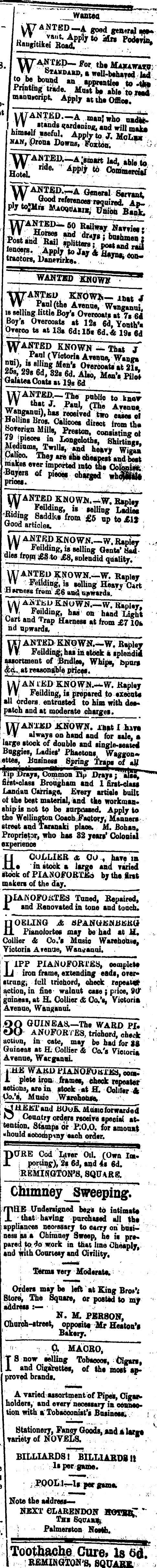 v. ~"^"3vajiiia ",, ■■•■■■■ ";T---JL J*^^ 1^ •■«***isiii " W^IHO.-A MniMho yaw, Downs, Foxfcon; ' 0 * WANpa^A^mtrt H lb ie to ■ *!,. r" 1^ 8 Avenue, Wvnganui, is selling little Boy's Overcoat, at 7r6d Boy's Overcoats at I2s 6d, Youth*Overco ts at 18a 6d;lss 6d.& 19s 6d Y^ANTBD KNOWN -.Thai J «ii\ • w o * o^ Avenne, Wanga nm), is ailing Men's Overcoats at 21s. GalateaOoatsa t l9s6d W A^fl).-The i public to knor _T V that J. P«nl, (The Avenue Wanganui),ha« repsived'two calea 5 Holl,nßßros.C.Ucoe. direct lroTthl SorerianMils, fteston, consisting o t J?JP»<*« > tongewths, ShMtogs, Mediums Twill^&d heavy^? g S Calico. Thejareih.che.pe.tandSTt makes ever imported ink! the Colbai»t; of pieosi charged whofnili prices* • . . WANTED KNO W JN.^W.B»ple f Feilding, is selHng Ladies Wood articles. y , ji , Fe »;ding,is selling Gsnts' Saddies fronTjßgto £8, splendid quality. W A ??IV KNOWN>-W. Rapiey Feilding, is selUngHeaTvCirt ; ii»rneßg frem £6 and cpwarda. W A^V K^«WN.-W. Hapley, . fT< FeUding, has on hand Light Cart and T ra p Harness at from £7 10* na upwards, m ANTED RN©WN.^-W. fisple? Tf ; Feilding, has m stock a splendid assortment of Bndles, Whips, bpurf &&, at remoDatie prices. U/ AN TED KNOWN.-*. W.Kapley VTj Feilding, is prepared to execute all ordera entrusted to him with des* patch and at moderate charges. WANXKD JCNQWN. ia»t I hive always on hand and for sale, a large stock of double and single-seated Buggies, Ladies' Phaetons, Waggon* ettes, Bnsineas Spring Traps of aH Tip Urays, Common nji Drays ; 'aisev first-class Brougham and 1 first-class Landau Carriage, Every artisle built of the best material, and the workman* ship is not to be surpassed. Apply to the Wellington Coach Factory, Mannera street and Taranaki place. M. Bohan, Proprietar, who has 82 years' Colonial experience ■ H COLLIER 600 , have m • m stock a large and! varied stock of PIANOFORTE* by the irtfc makers of the day. )lAJNOFOitTES Tuned, Repaired, X and Renovated m tone and touch. riOELING .& aBAJSMEXBtitU} 1 Piandiortes may be had at H. , Collier & Co.'s Musio Warehouse, Yiotoiia A venae, Wsnvaaoi. T IPP PIANOFORTES, oomplett JJ iron frame, extending cads, over* strungi f till trichord, check repeated ; action, m fine- walnut case ; price, 9& l gninjns, at H. Collier & Co.'s, Victoria Avenue, Wanganui. ' ' QQ GUINEAS.— The WARD PI. OQ ANOFORTES, trichord, check actiun, m cate, may be had for ?ft Guineas at a ; Col Her & Ccs Victoria Avenue, WarganuL , |;HE WAKD PIANOFOttXJSS, oo«: I plete iron frames, check repeater actiona, are m stock at fl. Coliltr 4 Co.'s. Moaio Wsrehonsa. wi H EET and HOu£. Mtisie forwarded KJ j Country orders receive special attention. Stamps or KO.O. for amouat should aofeompiny each order. PaRE Cod Liver Oil. (Own ImV porting), 2s 6d, and 4i 6d. REMINGTON'S, SQUARE. THE Undersigned bezs to intimate that: having purchased all the ; appliances neoessary to carry on busW nessas.a Chimney Sweep, he is pre» pared to Aq mork m that line Cheaply, and with Courtesy and Civility, Terms very Modtrate. Orders may be left at King Brort Store 1 , The Square, or posted to my address:— -J . s N. M. PERSON, Cfharch-street, opposite Mr Heston's '; i Bakery. ~^" i -.-ft MAOROj ~" T Sn ?V^* Tolwoooi, tSgars, 1 and Cutarettes, of the most approved brands. A varied assortment of Pipes, Cigaiw holders, and everr necessary m obnneotion with a Tobacconiit's Bnsiness; 3 < Stationery, Fancy Goods, and a larta variety of NOVELS. ; •".•■.. BILLIARDS! BILLIARDS 11 lipergame. :-FQOL;!--lf ilergataet Note the address— NEXT CLARENDON HOTBR* *" THI 6QtTAK%. : Palmerston Noirtb. [To^aclmCure, is ci. I REMINGTON'S, SQUARE. ■
