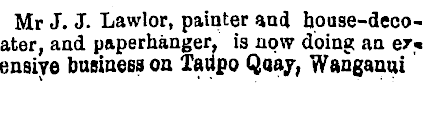 Mr J. J. Lawlor, painter and h.ouse-deco-ater, and paperhanger. is now doing an er« ensive business on Taupo Qaay, Wanganui