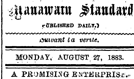 Manawatu Standard (PUBLISHED DAILY.) Suivant la verite. MONDAY, AUGUST 27, 1883. A PROMISING ENTERPRISE.