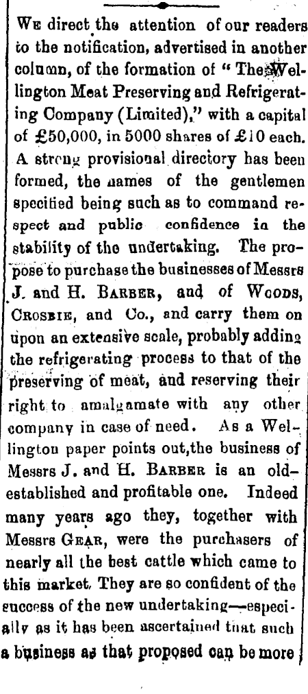 We directthe attention of our readers to the notification, advertised m another column, of the formation of " Thej^ellington Meat Preserving and Refrigerating Company (Limited)," with a capital of £50,000, m 5000 shares of £10 each. A. strony provisional directory has been formed, the names of the gentlemen specified being such as to command respect and public confidence ia the stability of the undertaking. The pro"pose to purchase the businesses of Messrs J. and H. Barber, au4 of Woods, Orosbie, and Co., and carry them on upon an extensive scale, probably adding the refrigerating process to that of the preserving of meat, and reserving their right to amalgamate with any other company m case of need. As a Wellington paper points out.the business of Messrs J. and H. Barber is an oldestablished and profitable one. Indeed many years ago they, together with Messrs Ge^r, were the purchasers of nearly all the best cattle which came to this market, They are so confident of the success of the new undertaking—-especi-al lv a8 it has been ascertainfld that such a bujinesß a* that proposed can be more j