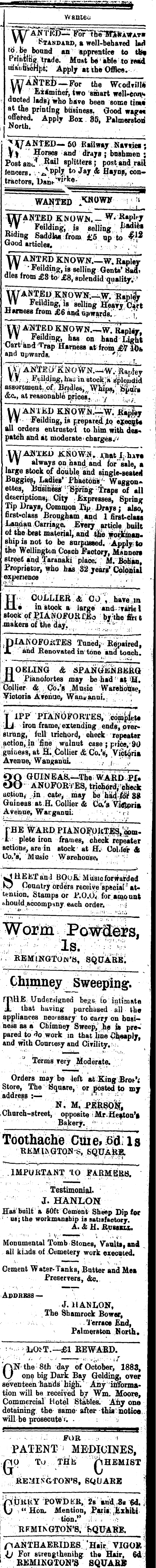 Y^antea TK fe tonb**m*k*Arm *T Standard, a well-behaved laH Q-tif .fcoond' an apprentice to tfet Printfnk trade. Murt be able to r«wl ufanfalicrlbi: Apply atthe Office. WAITED— For the Wcodvill* Eximinef, two smart w«ll-eoiv» i. ducted lads) who hive been some tin* at the printing business. Good wag«« offered. Apply Box . 85* Palmerston , Norths JX/'ANTED— 50 Railway NaTtiei ; \ | ' Horses and drays ; bnsbmeu ; Postanuf -•.•?■*! splitters; post and rail fencers, v to Ja J . * Haynp,^ 'omtractors. l)an^ ;^ ke ' . .'/ \.- : -., WANTED ••-: 'n ANTED KNOWjN.- W. Rapley ' Feiiding, is selling Mfa Ridmg SaddJw^ from £5 up to M 2 Good articlet. ; . > .%' ANTED KNOWN.— W, Rapley Peildinop, is selling GentsVSaJi dies from £8 to £8, solendid quality^' VV Folding, is selling Hearyfeitt Harness frem £6 and opwards.': 7 AiNTEDKNpWN.^W.RapIi f , Feiiding, has on hand Light Cart-and Trap Harness at from £78)* and upwards, ' ! '); " W : A"N^ED ? KN:UWN.^W, Kapfey ' * * j. bus m stock ,'a^pleiidid asßorsnaent, pf , Bridles, ?/ Wlwp9, &c, at reasonable prices. v . -y '■'".'•--■.*•' \jU ANXJSD KKOWN.~W. Kapley f f Feiiding, is nrepare^jtQ execiu all orders entrusted to hun with dea* patch and at moderate « charges.' AJI^JD ICNOWiC JLhat I,h^a always on. hand, and for sale, a large stock of double and single-seated Baggies, LaOni' Pha6t6hs ; Waggonettes, jßusinesa 1 ; ;Sprf% ; Traps of all descriptions*: City Expresses, Spring Tip Drays, Common lip Drays ; also, first-class Brougham , and 1 first-class Lanaaa Carriage Every article built of the beet material, and the worlcmanship is not to be surpassed. Apply to the Wellington Coach Factory, Manners street and TaranaJcr place; M. Bohan, Proprietor, who has 82} years' Colonial experience ■ ; , • H COLLIER <fc Col, hayejn • m stock a large and rariel stook of pANOFpR£Eo brthe firt t makers of ifche dayj . ''': : : :^. ■: ,., Tuned-^Repaired, JL 'and Renovated intone ah 3 touch, i nOBLING & SPANC^JfiNBERG JJL 'Pianofortes may be had ! at S. Goilier & Cb«'«i .Music Warehouse, ' Victoria Avenue, Wani* anui. , .; . : '"\ ■ , ' . . . :»ip T 'iPP' PiANOFORTES, Iconipijte Jj iron frame,' extending ends^ overstrung, full trichord, oheck repeater action, m -fine . walnut case ; pricey 90 goiueas, at H.CoUier (fcCo.'s, Victoria Avenue, WanganuL ."•/. ] ...,.''"'[. QO GDINEAS^^-Jrhe; WARDiiI. OO v ANOPORTES^ trichprdftelieck action,; m : cat*-, may be ! had lo 88 Guineas at H. Collier & Co. 's Victoria 1 Avenue, Warganui. ; •r ) rHE WARD PlANO^liTis^own. 1 plete iron frames, check repeater actions, are m stock at H. Col.ler & \ Co.*si Music Warehouse. '; ; * Music forwaried ; .}D Cpuatry orclers receive special " attention. Stamps or P. 0.0.1 for amount >hould .accompany, each order* : i Wpriii "Po^airs, ' REMINGTOWS, SQUAREi Ghimney mHfi, Undesigned begs to intimata J. that having purchased all the appliances necrssary to carry on business as a phimney Sweep/ he is pre- 1 pared Jo «Jo work m that line Cheaply, and with Courtesy and Civility. ■;,: " Terms very Moderate. \ Orders may be left at King Broh'i Store, The Square, or posted to my address:'— : il ' L ji '. n; m, pjEtisofe ■ Church-street, opposite -i Mr Heaton't ; ' ' ■' ■ '■ ; Bakery. ''■" :■■ ■'■■■!■■ Toothache Cm c, 6d is I | REMI&QTON'S, SipjARE. I . IMPU RTANT f lo tARMEHB. I Testimonial. I J. HANLQN I Haabuilt a 60ft Cement Shwp Dip for r ua; the workmanship is satisfactory. . A. <fc H. Rxjuell. Monumental Tomb > Stoneß, Vaults, and all kiads of .Cemetery work executed. Cement Water- Tanks, Butter and Mea i Preservers, &c., Address — J. HANLON, The Shamrock Bower, Terrace End, Palmerston North. ■ LObT.— £l BEWABD. ON the Bth day of October, 1883, one big Dark Bay Gelding, over seventeen hands ' high". * Any information will be received by Win. Moore, Commercial Hotel Stables! Any one detaining the- same' after this hotico will be prosecute r. ...... : ; ■• •• •- : - - - ; >" FOR ■■ i PATENT MEDICINES, ,no To this |ShemißT JBLEMIJfGrTON'S, SQUARE \ POWbKtt, 2s and.B a | \j "Hon. Mention, Paris; itxhiki :-••■' •■• ■ ■ -• • 'tion." -is.v , -./i RFMINGTON'SV >QPA|tE. -i r : • '",'■'' — ','.' '' : '''' ** I /^ANTHAERIDES ;Hairf VIGOR I lJ For strengthening, the Hair, 6d; REMINGTON'S SQUAftB