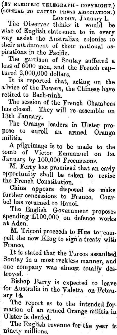 (by electric telegraph- copyright.) (SCPEIAL 10 UNITED FItKSS ASSOCIATION.) London, January 1. The Observer thinks it would be wise of -English statesmen to in everyway assist ihe Australian colonies to theiv attainment of then- national aspirations in the Pacific. The garrison of Soutay suffered a loss of 6000 men, and the French captured 2,000,000 dollars. It is reported that, acting on the a Ivice of the Powers, the Chinese have retired to Bach-ninh. The session of the French Chamber* has closed. They will re -assemble on 13th January. The Orange leaders in Ulster propose to enroll an armed Orange militia. A pilgrimage is to be made to the tomb of Victor Emmanuel on Ist January by 100,000 Freemasons. M. Ferry has promised that an early opportunity shall be taken to revise the French Constitution. ; ■ China appears disposed to make further concessions to Erance. Courbel has returned to Hanoi. The English Government proposes spending LIOO,OOO. on defence works at Aden. M. Triconi proceeds to Hue to-com-pell the new King to sign a treaty with France. It is stated that the Turcos assaulted Soutay in a most reckless manner, and one company was almost totally destroyed. . Bishop Barry is expected to leave for Australia in the Valetta on February 14. The report as to the intended formation of an armed Orange militia in Ulster is denied. The English revenue for the year is ninety millions. ■