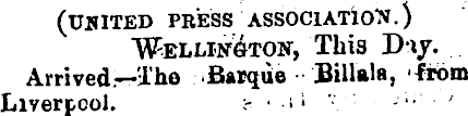 (UHITED PRESS ASSOCIATION.) Wellington, This Day. , Arrived— iho Barque Billala, from Liverpool. > • i • ' - ■'•• • '