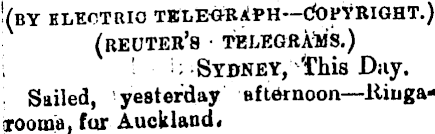 !(BY EIiEOTRIO TKIiEOR/iPH— dbPYRIOHT.) (rEUTER'B • TELEG'ItA ! MS.) ; ' -Sydney, This Duy. Sailed, yesterday afternoon — Itiugaorooma, fur Auckland*