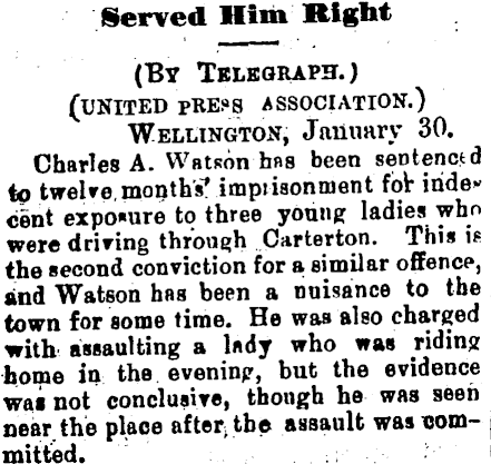 Served Him Right (By Telkoraph.) (UNITED pREPS ASSOCIATION.) Wellington; January 30. Charles A. Watson fans been sentenced to twelve, months' imprisonment for iride* cSnt exposure to three young ladies who were driving through Carterton. This is the second conviction for a similar offence, and Watson haa been a nuisance to the town for some time. He was also charged with assaulting a lady who was riding home m the evening, but the evidence wai not conclusive, though he was seen near the place after^tbe assault wastjommitted. v ;;■■
