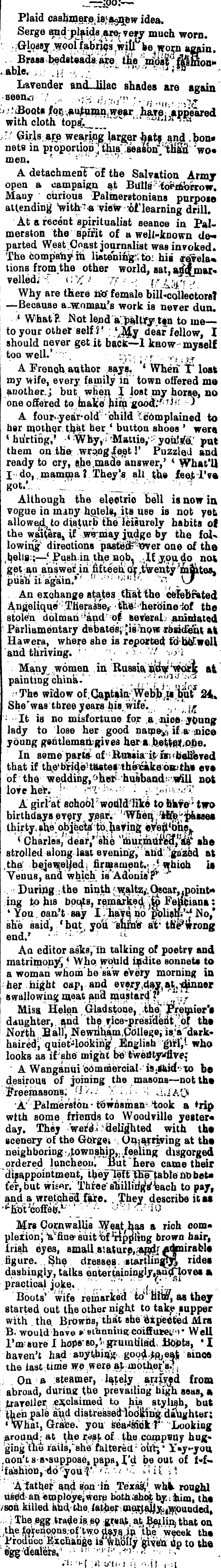 Plaid cashmereJsfagnjßw idea. Serge a£dj3]aid/.arej vety much worn. jGlpasv .wooHabrl^s^wiU again. BraaabedsUad&aw^ tjjw 'rists'fsßlion* Lavender and-Jilac shades are again seen*; 7 .... ;■_; ,;,-,,, -p ;.. . , -».r : j ii&QQU fqr r^nmn { wear^ hare 'appeared with cloth topa. , * ***.v.*& , * ;' Girls are wearing larger tats and ,bon« nets m pioportipb jthiß^seasbtfJtliati wo« men. ' '•'''" ' ~ '' - A detachment "o£ the Salvation Army open a campaign at Btftla 5 topribkow. Many curious Palinerßtonians pnrpoie attending Vith/?* vievr -6£ learning drill. At a recent spiritualist seance m Palmer ston the spirit of a well-known de-» parted West Coast journalist was invoked. The company m lUteni%;to: his ievela% tions f rom.the other world, sat, ajiimar* veiled I -" " iV : £ i 77/ .-• y l%'\--> Why are tKere m female bilKcoUeetoral — Becauae ajvcoman's work is never dun. ♦ What R Not lend a.WtJf jr tf n to me— to your other sell?' ; 'J£y dear fellow, I should never get.it back—l know- myself too well.' : r, -.. , r ., A French author says, ' When T? lost my wife, every family m town offered mo another-.; but when I lost my horse, no one offered to bake hio? £ood. rr^' r ) A four-year-old ' child Icdmplained to bar mother that her ' button shoes ' were, 'hurting, < Why, •»' slattie,; ; youJjfC put them on the wramg i eet T Puzzled and ready to cry, sbe.made answer,' < What'U I do, mammal They 'a all the feejt I've got.'. . :j ;'..__." :.___; : ;:'_ "■ i " ! Although the electric bell is now m vogue m many ho-tela, its use is not yet allowad to dJßturb the leisurely habits of the waiters^ if wrmay judge by the foU lowing' directions partiei£%ver one of the ,b,eUg:;— _' Pushan the nob. .y.ojido. not get an ans wer .in nf teen ox ,tWenty 'm&tea, push' li. again.*"' ■" <; '' ;l! ' f w \J , An exchange states .CftaHhe celebrated Angelique Theraaae,- thß^ 'herbineM the stolen dolman 'and' df several animated Parliamentary dßbateß;iis?npw r&sJd3esn afc Hawera, where she is repotted ftitteXweJl and thriving. ' • ; 2 ,V -i.-y-i Many .women m Russia tid^'wxirif at painting china- . i .!". >JJi/ ; 3 J -The widow of; Captain; I , Web'b^'iiu? 24, ShVwas three years bis, wifeV ; '_ yr '■ It is no misfortune for a nice young lady to lose her good naqoe^ if a- .nice young g»ntlemaagivea her a be^fitofie. In some parts- of Eu»«ia it wnfbal&Ted that if the' bride l tasterthecikeott-th* eve of the wedding, ''her; husband: will not loveheX. }'■ ' ■."■'{■■!'"■■* - ..■■■^r.^n'V A girPat echobrwodldiike to nkve'' two birthdays every year.; ; 'WBeq ; lllfe^paMea . thirfcy,Bhe abj^ytb.having e.vefl'ohej. Charles, dear,' she aiurmur'^'at the strolled along last evening, and iS goae4 at .the' bejeweyedi firmament.'-./ which ia Venus, and which is* Adonis r . : During the ninth :^altz,vQßoar,, point* ing to his bp^ts, remailied ( Fepiana : ' You , can't say I 'have no polisft'^ No/ she said, 'but, you shm'ef af the v wrong end.' • : ; ' ; v An editor aska, Tn talking of poetry and matrimony-, * Who would indite sonnets to a woman whom' be 'saw every morning m her night cap, and every .day^at^ pinner swallpwinsfiaeat juiH mustard? '■ l ' Ui^r Miss Helen Gladstone, . the] jPremier'e daughter, the rice-presi'deiit, of the North Ball, NewnhamXJbllege,- ls.^darkhaired, quiet-looking English girl', l - who looks as it'she might be twetftyi^iref A Wahganui 'coaamercial- is.iaid' to be desirous of joining the masons — not the xFreemasonß; f i ' . - V •■ -i - '•'-. dJ&O •A' Palmereton - tSwbaman- took a *rip with some friomis to Woodville yester* day. They we/e'^ iieligli ted with the scenery of the Gorge* Un^ arriving at the neighboring ,Jownship, ; feeling disgorged ordered luncheoin But here came their disappointment, iheylf?F]ffie7table no beU fer,but wisAr. Three' anillfii^s'^ach to pay, and a wretched fare. .They describe it as '_ ■■'■"• !^- r: i 0 Mrs Cocnwallia Weatbas a rich oompleiioh; "a^fioe 1 suit t)f tippling brown hair, Irish eyes, smaU aiMu,re,jaßdf admirable figure. . She dresses ■tartlingTß rides dashingly, talks enter^aioingiy.ana,{ovea a practical joke. f "". '/ , -' Boots' wife remsriwcl io u liiif, as they started out the other night to take supper with . the Browns, that she expefefed Mrs B. would hove * 'Biinnittn coiff uwfi • Well l'maure I hope'so/igruuitilad, JBcj>ta, • I haven't had anytiitf};. good.^OjeaJi since the last time we were at-ißOthe^ai; ; . On a steamer, ia,jeiy . awjyed from abroad, during the prevailing' high seas, a traveller .exclaimed to his stylish, but Ifcheh pale a^d distresseii-lboMngdaliifhter; « What, (Jrtfce. you sea-JsickT Looking around; at the r.*st of the coxupHdy hugging fho rails/she faltered : bititi* Y»y»-you r Qoa't s s^auppoae, paprtj I'd be out of M« I/fashibttj-dd-you^' '•" - '- ;1 ■ Atather aqci son m Texaai 1 wht- roughl usffd an Employe,' were both/sht^t by.;iua, the /son killed and, the, father WoxjaJbkgjHpuuded, 1,; i Xheeggtra^eissp gtua&,. a^^jfiinjthat ou the weeek th« , Produce Exchange ia wholly 'given dp to the [egg •dealers, 1 l 1!; ■"»r -.^*° \-r '. .'*; >-f ;« u-ii'j .;"; -..if j- = i