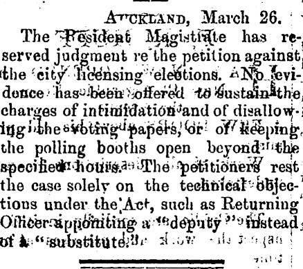 Ar^egciND, March 26. • - The Msjglstr*(te has re- ? served judgment re the petition against; fthe licensing 'elections. '■ donee •■ has^-'bfeea >4)iFer&l iA charges of infinJi'dation^and of disallo^-f ing i>lh c s¥btin'g^'paiiefs j' W oFiee^pm^ f the polling booths open bcyond 3ri thJß 'Bpecifie*ili6ttm3«^he'^e^ti6 i 'ner| r rest the case solely on the teehnicat-bbjec- 7 tious under the|Ac^ such as Returning' tOilic"er-Tipfi6%i£ilfg^ a itrf^"®rbstitttte'jyf -aU i- r < -{sh ' .