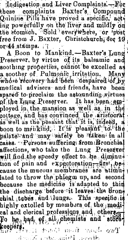 ■ [Indigestion and Liver Complain t^-r-Eoc itbese iqpmplainta Baxter's. CpmpjOtin.dl Quinine Pflf^ha've proved a specific,' act'j ing powerfully oh the' liver and mildly onj tbe sfomnch, '-'Sold. ! everywhere, or free from J. Baxter, Cbriatchurch, :^oj; 1Q j or<44,3ta7mpg. ii . .• |. ( A Boon to Mankind.— Baxter's Luns ' Preserver, by virtue of its balsamic and soothing properties, can not be excelled as a soother of. Pu.lmohic irritfttiou. Manj Recovery had -D^en deßp'airfea^f3y medical advisers and friends, have been spar«d ; to 'proclaim: the astounding jvirtues fif!th^ ImugiPteseryer. It has.bperl-.ftm-ployed m. the, mansion as w.ell.a^..in tl^e poltAge, and tas copVince'd !tlje ,afist l o'cral < as well as t'h'e'piaaant that it ls, ! in<!e4\l, a : boon to mptilcih'd; < ! . It 1 1d ; pleaSa ( Af: t to / . i 'tti6 ' jJa ; l^e-and imay-'skfeiy be HAk&n* 'm all cases. 'Persons suffßringiiromißronchial affections, who take the Lung Pregeijver will fiad.jthe speedy effect to. <b;e . d^mjnui tion of pain and exp'f|c,tpratjp^|-?4 i r,Bfj l( s»p.| cause the mucous membranes ' are'tttimu' 1 lated to throw thf phlegm up, and seconc because the medicine is adapted to thit the discharge: before "it leaves- thA ffrom ; chial itabe's , and \lungs;» This fipecih'Oiii ' highly extolled by meuib^rs o^ thejinediif cal and clerical prpfeaViqng ( and, other^mb^jljßfdy 1 ahd'stoK&s*s!-,,;'; .*4."» .;.'..> -.• 8 «.oi. o-^T