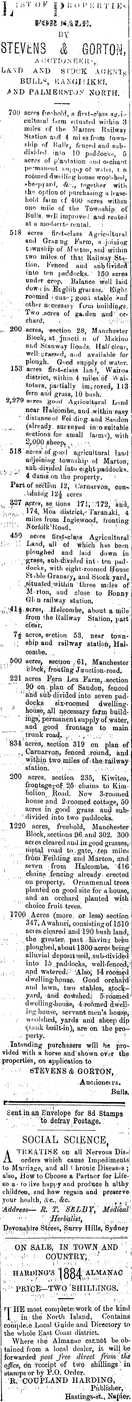 i i ti'V OV |)!iiH' !■; L-iTiKs -I J I FOII WARE. STEVtNS & GORTON, ■ AU(!TJu.NEIi;it-y ; LAND AND STOCK A(3KN'T lS BULL^, HANOI! IKB F. j AND PAiuMERBTON T NORTH. 700 acres freehold, a firsUc'jiSß a^.icultnra! farm situated within 8 miles of (he Marton Railway i •:' ■ ■ Station and 4mi es from fon-n---ship of BoT'lf, fenced and subdivided into 10 paddocks, 5 acros of .plantation .mk! orchard permanent snj.njy ot w,>tn, t n roomed dwelling house woo:'>hed, she^pyard, & together with the option ol purchasing a leasehold faim of 400 (icres withm one mi!o of the Township, of JBulls, well improve! and rented at a modorrte rental. i 518 acres first-class Agricultural and Grazng Farm, a joiyiug township of M'uton, nnd within two miles, of that Railway ,SH T tion. Fenced and subiividecf into ten paddocks. 150 acres under crop. Balance Well laid do?/ 1 m Erigliiu grasses. : Eight roomed i pus" ; gooi stable *«ncf other mcesSary firm buildings, . Two .acres of ga.den amd! orchard. ■ ( .. = :..>; ?"[.: = _ .200, acres, -section 28, Manchester Biqckj at; jtmcti n of Makino and iStanway Roads. Half clear, well: urassr-d, and available for. plough. Good supply of water. 153 acres fir.<t~class land,; Wairoa district, within 4 miles' of Wai*' totara, partially imj. roved, 113 fern and grass, 10 bush. '. 2,279 acres 'good Agricultural Lynd near Halcombe, and within easy ' distance ol Fei ding. and Sandon ,- (already., surveyed inro suitable sections for small farms), with ... 2,000 sheep.- , . : ■518 ' acre's of good agricultural land adjoining township of Marton, .. ; . ? sub -divided into eigh,t paddocks. ''-'-*"■ 4 dams on the property. ' ! Part of seclFon J2, ('arnarvon, con^ .binin'g 12-| acres ; vW 1 cres ? W. l J? M i' 7m ' '172,: ati'a, ;.., niil ; 174, Moa district,-' Tavanaki, 4 miles frpm Inglewood, fronting ■"'"' •■'''' Nbrfdlk'koad. L r . 450 acres firs>class Agricujtnral !:< II Land, all of which has been ploughed and laid down m •gr,ass, sub.-divided int » ten paddocks, with eight-roomed House Sttble Granary, aud Stock yard,. ; three miles of M-rton, aud close to Bonny Gli n railway station. .Halcombe, about a mile from the Railway Station, part' •■ clear. • . 7£ acres, sretion 53, near town- ,. ;■ ship and railway station, Halcombe. . . i • . , 500 acres, section /61, Manchester block, fronting Junction-road. 221 acres Fern Lea . Earm, .section ' ,90 on,. plan of Sandon, fenced iJ and sub- divided into seven pad- ... docjk^ . six-roomed dwelling- '■ * house, all necessary fajm build- ' " iiigs) permanent supply of ,\yate,r, _ _ a ?.^- gPP4. frontage to main *"" ' trunk road. . r - .- - , ,-,■ r, ■ 834 acres, section 319 on plan of , t ., f , , Carnarvon, fenced -round, knd " . within two , miles of -. the: rail way- ' station. ; ... : . ■ .'=.•■>•■ > 200 acres, section 235, -Kiwiteaj. f.rontage^of 25' chains to Kiinbolton Road. Now 3-roorned house and 2-ropmed cottage, 50 acres m good grass and sub.- --' 'divided into two paddocks.. 1220 acres, freehold, Manchester Block, sections .9.6, and 302, 300---acres cleared and. in gopd grasses,' riveta,l road to.gate, iten miles: '.from and Ma'rton,.and' seven from Halcombe* '4 1 6 cliainft fencing already; erected on property. Ornamental trees planted on good site for a house, and an orchard, planted "with choice fruit trees. , ; 1700 .Acres (more : or less) section 347, A wahnri, consisting of 1510 : . , acres cleared andl 90 bush landj v , ; the greater), pait ha vin u beb« "■*..'. about 1300 acres being 1 . alluvial deposit !spi],.sub-flividkl into 16 .paddocks, well-fence-icl-,"' ;!> . and watered:- iAHsoj l4r6omed <lwel ling-house. Good orchaW* and lawn, two stables, sjoek- ;; .;, yurd, and co^shedi; 5-rqomed f ■dwellingihousej-' 4-po6med olwell- , . ing-house,, servant men's hou'sje; ! / ttnolshed, yards and sheep dip ((lank built-in), are on the prq- . : ,i pefty. : •■•- ■• , ! Intending purchasers will He prp^ vided with a horse and shown over the properties, on application to (STEVENS & G6ftT6N, ; ..:-• _•; lAuc donet i a 3. Bulls. - ; '/ ' ,- : 1Sent man Envelope for 8d Stamps • ; ' ' ' 'to defray , Postage. . SOCIAL SCIENCE, " ; A TREATISE on all Nervous D is -4 orders which cause Impediments; to Marriage, and all ( hronic Diseases ; also, Bow to Choose a Partner for Life-i so a- to live happy and produce h althy children,, and how regain and ; preserve' your health, <&.c. &c, ._ r ; •Address-- B. T; S'JSLBT, Mddihal] ''-•'■ ' 'Herbalist. , , : Devonshire Street, Surry Hills, Sydney ON SALEj IN TOWN AND ' : ; ■■ ■■ ■•.!' :■.- COtJNTRTi;';- ■' • "' \ ...-.!-',■.■ I i ;'-.'-.:i •••!. • ' '■■' '",'■'' H ARDINO'S 1 Rfi A ALMANAC ! - !1 PRICE— TWO 'SHILIJNGS. ; ri'HE most coni])tete^, work of the kind I. in the North Island, Contains coiiifileie Local Guide and Directory to the whole East Coast district. Where the Almanac cannbt be obtained from a local dealer, it will be forwarded post free direct from \ the office, on receipt of t\vd shillings \in stamps or by P.O. Order. X COUPLAND HARDINGr, - ■'■'■■..:>■■ < ' ■ : ; Publisher,' Hastings-st., Napier.