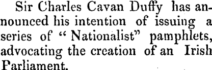 Sir Charles Cavan Duffy has announced his intention of issuing a series of " Nationalist" pamphlets, advocating the creation of an Irish Parliament.