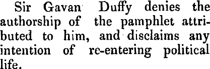 Sir Gavan Duffy denies the authorship of the pamphlet attributed to him, and disclaims any intention of re-entering political life.