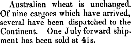 Australian wheat is unchanged. Of nine cargoes which have arrived, several have been dispatched to the Continent. One July forward shipment has been sold at 41s.