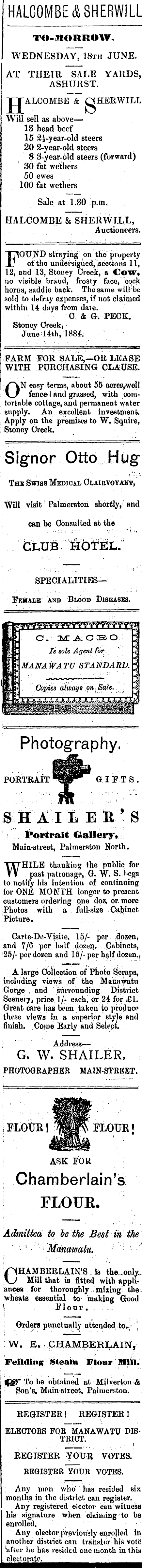HALCOMBE&SHERWILL TO-MORROW. WEDNESDAY, 18th JUNE. AT THEIR SALE YARDS, ASHURST. TTALCOMBE & QHERWILL Will sell as above — 13 head beef 15 2|-year-old steers 20 2-year-old steers 8 3-year-old steers (forward) 30 fat wethers 50 ewes 100 fat wethers Sale at 1.30 p.m. HALCQAfBE & SHERWJLL, Auctioneers. FOUND straying on the property of the undersigned, 'sections 11, 12, and 13, Stoney Creek, a Cow, no visible brand, frosty face, cock horns, saddle back. The same will be sold to defray expenses, if not claimed within 14 days from date. C <fc Gt. PECK. Stoney Creek* June 14th, 1884. FARM FOR SALE,— OR LEASE WITH PURCHASING CLAUSE. ON easy terms, about 55 acres,well fence I and grassed, with com* iortable cottage, and permanent water supply- An excellent investment. Apply on the premises to W. Squire, Stoney Creek. Signor Otto Hug The Swiss Medical Clairvoyant, Will visit Palmerston shortly, and can be Consulted at the 'int TTT> ipr/^ir'TrT . LJ-lU.D JtIVJ I JI( J-.. SPECIALITIES— Female and Blood Diseases. /« sole Agent for •. ' N MANAWATU STANDARD. •* H . Copies always on^ Soilc. =t Photography. PORTRAIT Q I FT S . SKAIL Eil'S ; Portrait Gallery, Main-street, Palmerston North. WHILE thanking the public for . past patronage,. G. W. S..i»egs to notify liis intention of continuing for ONE MONTH longer to present customers ordering one doz. or. more Photos with a full-size Cabinet Picture. Carte-De-Visit e, 15/- .per. dozen, and 7/6 per half , dozen. Cabinets, 25/- per dosren and 15/- per half dozen. r A large Collection of Photo Scraps, including views of the Manawatu Gorge , and surrounding District Scenery, price 1/- each, or 24 for £1. Great care lias been taken to produce* these views m a 'superior ..style and finish. Come Early and Select. • " Address — G. W. SHAILER, PHOTOGRAPHER MAIN-STRiSET. i FLOtJE ! HK* FLOUR f ASK FOR Chamberlain's FLOUR. Admitted to be the Best m the '' Manawatu. /CHAMBERLAIN'S Is the^only. \J Mill that is fitted with appliances for thoroughly mixing! the wheats essential to making Good \ Flour. i Orders punctually attended t0... \ W. E. pHAMBERLAIN, Felldlhg Steaim Flour mil. l^f" To be obtained at Milyerton &: ; Son's, Main-street, PalmerKton. REGISTER! REGISTER! ELEOTOBS FOR MANAWATU DISTRICT. REGISTER YOUR VOTES. REGISTER YOUR VOTES. Any mpn who has resided six months m the district can register. Any regiatered elector can 'witness-' his signature when claiming to be enrolled. Any elector jireviomly enrolled m another district can transier his vote 'after he has resided one month m this eleetoralo^^^^^^^^^^^^^^^