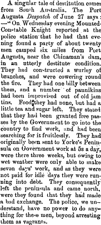 A singular tale of destitution comes from South Australia. The Port Augusta Despatch of June 27 says : — * c On. Wednesday evening MountedConstable Knight reported at the police station that he had that evening found a party of about twenty men camped six miles from Port Augusta, near the Chinaman's dam, m sin utterly destitute condition. They had constructed a wurley of branches, and were cowei*ing round the fire. Tlxey had one billy between them, and a number 'of paunikins had been improvised out of old jam tins. Foorljthey had none, but had a little tea and sugar left, They stated that they had been granted free passes by the Government to go into the country to find work, and had been searching for it fruitlessly. They had originally been sent to Sforke's Peninsula on Government work at 5s a day, were there three weeks, but owing to wet weather were only able to make sevon days' work, and as they were not paid for idle days they were running into debt. They consequently left the peninsula and came north, were they found i.hat they had made a bud exchange. The police, we understand, have no power to do anything for the*e men, beyond arresting them as vagrants.