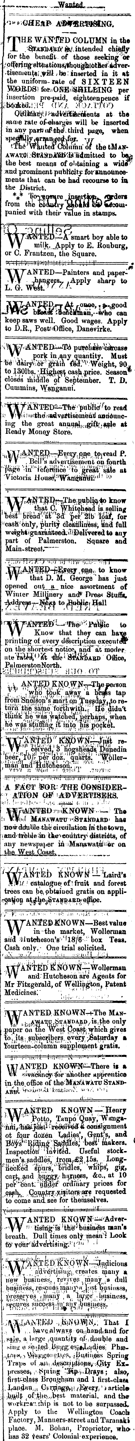 '^^CJHEjIF A^BHT^RVJStNG. rnHE WATTtfID COLUMN m the X .'■ffeaatiMftß ftA intended chiefly for the benefit- of those seeking ot . oaring eitmations^hQUghlotheradver. -tisemen^l.vili ybe inserted m it «t the uniform- rate of SIXTEEN toRDS? for.ONE)iSaiLEING per insertion pie-paid, eighteenpence if Qtfliiiktjyi-ad^fifeehients at the mate rate of-elmryes will be inserted m any parftirf the*, third page, when B}>eJ|la]k^risaaaejKfof. ',t/ cThe Wautea Obiuihu of the tMAir* AWAitfcStAStojHatfia admitted to W the best means ofolttaining a wide^ and prominent publicity fov^nnounoements that can be had recourse to m the District. from the c6aocry gtbillcl Ibv mcoui* panied with their value m stamps. WMTETJ—iiraiart boy able to «"Lk',-Apply to E. Rouburg, or C. Frautzen, the Square. WANTED— Painters and paperJhangera., ,Apply sharp to L. G. Wtest. ' ' ' x - keep saws well. Good wages. Apply to D.X, Postf'Office, Danevirke. •xVngr^-ttTEDWM pdM&Ae^ Vy pork m, any quantity. Must ■be dairyV^oF grain :^V:Weight, 90 . to J[3pibs • ( H|g^eß^ cash, price. Season* close* middle of September. T. D. Cummins, Wanganui. 1 read ■,} V ! V ' ! "fthe I 'iadvertisemfentl andduncing the great anttuft\ >;( giftf,*gle at Ready Money Store. m . iiell s aclveiusennmt on fourth "ppe •-{tf' l tetfei#ri©fli;'& siile at Victoria Houset^Wart^ffiii^ 1 ' 10 ."\XX^TED ir7 Tne;Rttblio / *) know , YV that C. Whitened is. selliQi? "wtf* m^ww ww w. for J cash only, pbity cliekiiiitfessi Snd full weightignaranteedu td any part of Palmerston. Square and Main-street,"*" W i AMEP-^^iy cTO cv ; to know that D. M, George ' has just opened out__*L. nice assortment of Winter MiiUnery and* Dress Stui&u ■^ddj'eas-j-Me^.i to ijuWicf Hall '■^%>/KOTBSD^--»Hi»>« P*#ic to VV Know that they can have printing" ofjeyery description executes on the shortest^ hotico, and" at inoder Hte'Ktf^OSßb Office, Palmei-stonNortb. ■. v AjS'TpKimW-^^^rson •v , !^r < 8^ a brsjis tap ffo'tii Sneifion's "marloja }t to reinmthe'same forlnVitn^" Etc didut think he was watched, perhaps, when he was stumnar it into his pocket. H- )'■>>;! jf!'» ,Ut')'- (f/j:. •■ .'/ ': tUi-fj- 'I > "•tjC^^E ! b ;Y i^W^4^ust re- . V r r ceived, 3 hogsheads Dunedm yma/Vf&MLo'n?/; 0 ' 111 - Tv ' YWf I! 7^O H >f 9.10: < I .?!S->T!.t; A FA : GT *OR: €)ONSI©ER--1 ' r ATION OF 'ADVERTISERS. *]BTTA!N r CBD/-t.-JKNOWN---- ; The !> VfoJ Manawattt t-STAicDARD' has nowdduUle the circdlation iii the town, . and' treWe m th^couhtry* diattddts, of any newspaper m Manawatu! i or on the Wesji Qoaat, „_ iN<6^f'tf '-i'Laird's xmt. : .''catalogue; of] fruit and forest trees can be, pbtaiued gratis on appli?^og a^^ST^fiAstn|o|aoe. ;■;"• Xi ■>> ' ';r.-i-:-. • ■ X: ,;t; •,■•]s?. .?■ •■ ( . . "TTTANIEBJSfNOWN— BestvaIue VV inthe market, Wollerman and <! IS/B • box Teas. Cash only,- One trial solicited. f .>\ yj.,7 :■■■■■■- ?,-, -yii.n {:■::,; .t^Aiteri^^OW^Wonerman , V V and' Hutchesoii are Agents for Mr Fitzgerald, of Wellijigton^ Patent Medicinesi" "",_ ., '*[' jIXTANTED.fiNOWN-i:The MakW^i^ Aa ffi^AJ. DA *»/««Ae onl y .paper on the Wes jCJpastj which gives lib v^ts ; BuVpc^ibers, every a Tourteen-column supplement gratis. .!■' ■:.».-i. i-..'-'.- X •■■> -'!■■ - WANTED KNOWN^There if a xivac^noy> another apprentice m theoffice of the'MAs'AWXTU Stand- • ■__ .'> ■<■ i:-\-\T7ANTED KNqWN— Henry J W'" Fpttp, Tanpo r buay,Wangai; nniy lia¥j«^ti're©e'i^6ff • consignment ot four dozen Ladjes* Gent's, and B*6^ lJ ß^ni'Sainil!es; best' makers. * Inspecti6ri : ' Tnviiled. Useful stockmen 'swaddles, irom^^ss. r Longr: iie'c^ea spWs;;' Dndles', wtii'ps; gig, cart, .and v bnggyy hijr^ees, &c, at 10 per 'bbnt: ; 'under ordfnary prices for ,Qo i^u t try.f,ifit9rs>aTe requested to come anisee for themselves. y;.,,. ■■•< j ■.- Wu , ; "T---WANTED KNQWIf » tisitig : i 8 ! th^bußinfßs man's breath. Dull times only meatf] Look to 1 yonr 1 aVlveVtising:'' i i3); '• [ ■ ■ <t ;\ t tglfertef Now^iidicioug "V y/ ( ' ajdvertisiiii,';. creates, ipany a new ( reyn-ep^manj -J A bu^ifit'ss, rescii^inuny a.^.^t' secures sneers!} .in' any jbnsiuess. .MwWWuU JiiNOStN.;' That I ... YV . lvav<« sal ways oq,ihand<and for , , ssj.,e, a large ,quantj jfcy of. : double and siiiii o s'e..t.ed'|jjig-g:e. < jijNL^dieß; Phaa- ; «^fti'»K-)V^K#§®»M J >t^>?s.iyu^i»\eßs Spring Trapb of .ujM.UjijiiCJii^on^^.ity Ex. presses^ , .Spiing ' '^ip.^ ,D,rays ; also, first'-clags Brougham and 1 first-clae* , LandW.n Gjjrjp v ajge,ti /Epferj, • > article ;i>}UwU { of;^l»^r..^?st material, and the workrca'uhip is not to be surpassed. Apply to the Wellington Coach Factory, Manners-street and Taranaki place. M. Bohan, Proprietor, who- - has 32 tears' Colonial- experience.