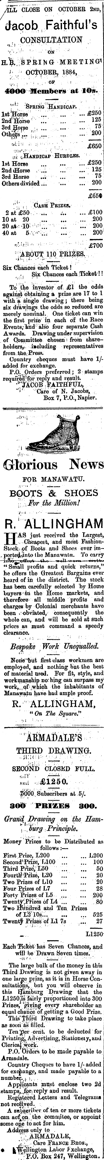 " . * — ..-■■. -. ..,-.,. — /SH T CLOSE ON OCTOBER 2nd, dacob. Faithful's , CONSULTATION •i.: J ■; • ■ • ' : '-'■'■- '{}■''..'-:'}■• '- -■' GS •'■ H.l. ;SPkIMGr MEETING* ; ; OCTOBER, 1884 r 4000 Members at 10s. °'*° Spein<3^Handicap. : , Ist^orse^ ."... ..,£250 2nd t Horse : ... ... . : ... 125 3rd Horse •„ ... ... ... 75 othfs^ ;;V : ... ; . '... ...200 u]:l:: - ; . / £650 OOi'i-'-':'-' ■ ./■•■••■, v i c>Hanj)igap Hurdles. : ' Ist Horse ... .... ...£250 2ndtHorse .... ... ... 125 3rd Horse ..i ... ... 75 Others divided... ... ... 200 MM '*'.'[ .': Cash Prizes. 2at£so . .;. .',. ...£IOO 10 at 20 ... 200 20at.:-lfc !^.;. ... ... 200 40 at s.'i>»?K;: • ... ... 200 v «!.«f.;i-' ■,;,■•■'• : / • ■:■;- T -: : ;£7OO no i prizes. Six Chances each Ticket ! f .,. , Six Chances each Ticket'! ! To the investor of .£1 the odds against obtaining a prize are 17 to 1 with a sjngle drawing; there being six drawings the odds so. reduced are merely nominal.. One ticket can win the first prize' m each of the Race Events;luid ; also four separate Cash Awards. Drawing under supervision of Qonimittee ohosen ! from shareholders;^ iacluding representatives from. the, Eress. Country cheques must have 1/added for exchange. P.O. Orders preferred; 2 -stamps required'foi' renly and result. "^ Care of N. Jacobs, : Box 7, P. 0., Napier. Glorious News FOR MANAWATU. BOOTS &T SHOES I \ .For the Million! f'L ■ f'- - R. s ALLINGHAM HAS just received the Largest, , -Cheapest, and mo r st FashionStock,, pf Boots and Shoos ever im- . ported/into ihe Manawatu. To carry "Small profits and quick returns," he offal's the Greatest Bargains ever heard of m the district. The stock has been carefully selected by Home buyers 'in the Home markets, and therefore all middle profits and charges by Colonial merchants have been , obviated, consequently the whole can, and will be sold at such prices as must command a speedy clearance. Bespoke Work Unequalled. Norie'tut first class workmen are employed, and nothing but the best of material used. For fit, style, and workmanship no: hing can surpass my work,^pf : ; W;hich the inhabitants of Manawatu have had ample proof. R. ALLINGHAM, "On The Square." JtBMADAIiE'S THIED DEAWING. ...jiru;}--: '-^j.'.- ; ' ! - '■'',' : ;'' SECOND CLOSED FULL. •^OQ. Subscribers at . 5/. 300 PKITZES 300. Grand, J)rg,wing on the Ham- \_.. t burg Principle, Money Prizes to be Distributed as follows : — First Prize, L2OO ... ... L2OO Second' Prize, LIOO ... ... 100 Third Piize';Lso ... ... 50 Fonrttf : Prize, L2O ... ... 20 Two Prizes of LlO 20 Four Prizes of L 7 .*. ... 28 Forty Prizes of L 5 ... ... 200 Twenty'jPrizeß of L 4 ". . . ... .80 Two Hiinidred and Ten Prizes of L'2 v IOs..V ... ... 525 Twentf Prizes of LI 7s ...'... 27 L 125--0 Ticket has Seven Chances, and will be^ Drawn Seven times. The large bulk of the money m this Third Drawing is not given away m one large prize, as it is m Horse Consultations, but you will observe m this IJaniDurg Drawing that the L1250,'1s fairly proportioned into 300 Prizes, jftyinjjj every shareholder an equal chance of getting a Good Prize. This"TKird Drawing to take place as soon as filled. Tender cent, to be deducted for Printing. Advertising, Slationeiy, and ClericaJ .^ork. P.O. Orders to be made payable to Armadale. Country Cheques to bave 1/- added for exchange, and made payable to a number..) ?,... . Applicants must enclose two 2d fitampsjjjim reply and result. Registered Letters and Telegrams not rec|iyed. A s«j>j|eVib"er..of,.ten or more tickets can ac^on.tbe; coma^itee, or appoint some ofie toact for him. Address only to . • V: ARMADALE, lZ^ t '.''pare Fbanoe Bnos;, ♦ kWeflinglon Labor Fxchange, 247, Wellington.
