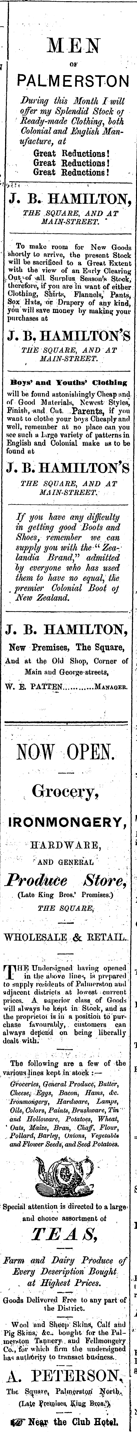 • 'ME-N OF PALME RSTON i During this Month I will offer my Splendid Stock oj Ready-made Clothing, loth i Colonial and English ManI ufacture, at Great Reductions ! Great Reductions! Great Reductions ! J. B. HAMILTON, THE SQUARE, AND AT MAIN-STREET. ' To make room for New Goods shortly to arrive, the present Stock will be sacrificed to a Great Extent with the view of an Early Clearing wQut^of .all. Surplus. Season's Stock, therefore, if you are hi wint of either Clothing, Shirts, Flannols,' Parity Sox Hats, ok Drapery of any kind, you'will save money by making your purchases at JVB, HAMILTON'S THE SQUARE, AND AT MAIN-STREET. ' Boys' and Youths* Clothing will be found astonishingly Cheap and of Good Materials, Newest Styles) Finish, and. Cut. .Parents, if you want to clothe your boys Cheaply and well, remember at no place can you see such a lirge variety of patterns m English and Colonial make as to be found at J.B.HAMILTON'S THE SQUARE, AND AT MAIN-STREET, If you have any difficulty m getting good Boots and Shoes, rememher we can supply you with the M Zea-; landia Brand" admitted by everyone who has used iliem to have no equal, tlie .. premier Colonial Boot of New Zealand. J. B. HAMILTON, New Premises, The Square, And at the Old Shop, Corner of Main and George-streets, W. E. PATTEN;...... .....Manager. NOW OPEE Grocery, IRONMONGERY, HAEDWAEE, r AND GENERAL s ' - • • ■ . i-i ■ Prod/uce Storey . (Late King Bros/ Premises.) THE SQUARE, : WHOLESALE & BETAIL. f■l HE Undersigned having opened ■I' m tlie ahove linen, is prepared to supply residents of Palmerston and adjacent di.stricls at lowest current prices. A superior class^ of Good^ will always be kept m Stock, and as the propi'ietoi is m a positioii to purchase favourably, . customers can always depend on being liberally dealt with. v : The following are a few of the variouslines kept m stock :— ; V Groceries, General Produce, Butter, Cheese,- Eggs, Bacon^ Hams, &c. Ironmongery, Hardware, Lamps, Oils, Colors, Paints, Brushware, Tin' arid Holloware, Potatoes, Wheat, ' Oats, Maize, Bran, Chaff, Flour, .. Pollard, Barley, Onions, Vegctabls and Flower Seeds, and Seed Potatoes. Special attention is directed to a large' and choice assortment of TEAS, Farm and Dairy Produce of Every Description Bought „ at Highest Prices. Goods Delivored Free to any part of the District. Wool and Sheep' Skins, Calf and Pig Skins,- &c« bought for the Pulmeivton Tannery, , aud Fellmohge)y Co., for 'which firm the undersigned has authority to transact business.. A. PETEKSON; The Sauaie, Pahn^rstoja (Late ¥? ei »»Bes. Bi;qßs m* Nep the Club HQttl.