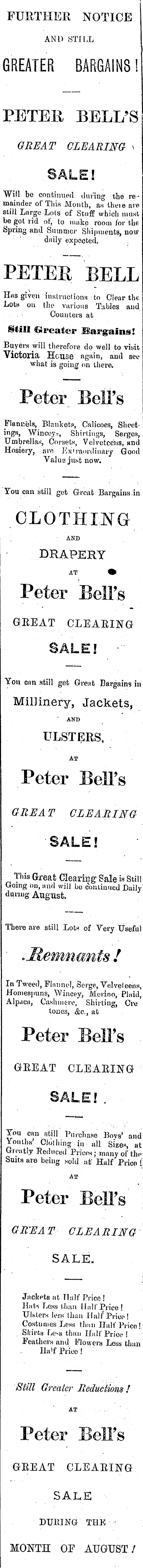 FURTHER NOTICE AND STILL GREATER BARGAINS ! PETEIi BELL'S aREAT CLEARING > SALE! "Will be continued during the remainder of This Month, as there are still Large Lois of Stuff which must be got rid. of, to make room for the Spring and Summer Shipments, now daily expected. PETER BELL H. •< as given instructions to Clear the Lots ou the various Tables and. Counters at Still Greater Bargains! Buyers will therefore dp well to visit Victoria House again, and see what is going on there. "Ppfpv "Rpll'q J- C/BAJL JJUiI © Flannels, Blankets, Calicoes, Sheetings, Wincey?, Shirtings, Serges, Umbrellas, Corsets, Velveteens, and Hosiery, aro Extraordinary Good "Value just now. You can still get Great Bargains .m CLOTHING ; and DRAPERY AT. • Peter Bell's GREAT CLEARING SALE! You am still get Gre.it Bargains m Millinery, Jackets, ' AND ULSTERS, AT Peter Bell's GREAT CLEARING SALE! This Great Clearing Sale w Still Going on, and wilJ be conliuu'cd Daily during August. There are still Lofc>? of Very Useful ■ .Memnants ! In Tweed, Flannel, Serge, Velveleens, Homespuns, Wincey, Merino, Plaid, Alpaca, Cashmere, Shirting, Ore tones, &c, at Peter BelTs GREAT CLEARING SALE!. You can still Purchase Boys' and Youths' Cloth ing. in -.all Sizes, at Greatly Reduced Prices; many of the Suits are being sold af Half Price ( AT Peter Bell's GREAT CLEARING SALE. Jackets at Half Price! Hiifcs Less than Half Price ! Ulsters less than Hal/ Price ! Costumes Less titan Half Price ! . Skirts Los than Hull" Price ! Feathers and Mowers Less than Ha'f Price! Still Greater Reductions ! AT . Peter Bell's GREAT CLEARING SALE DTJHING THE MONTH OF AUGUST/
